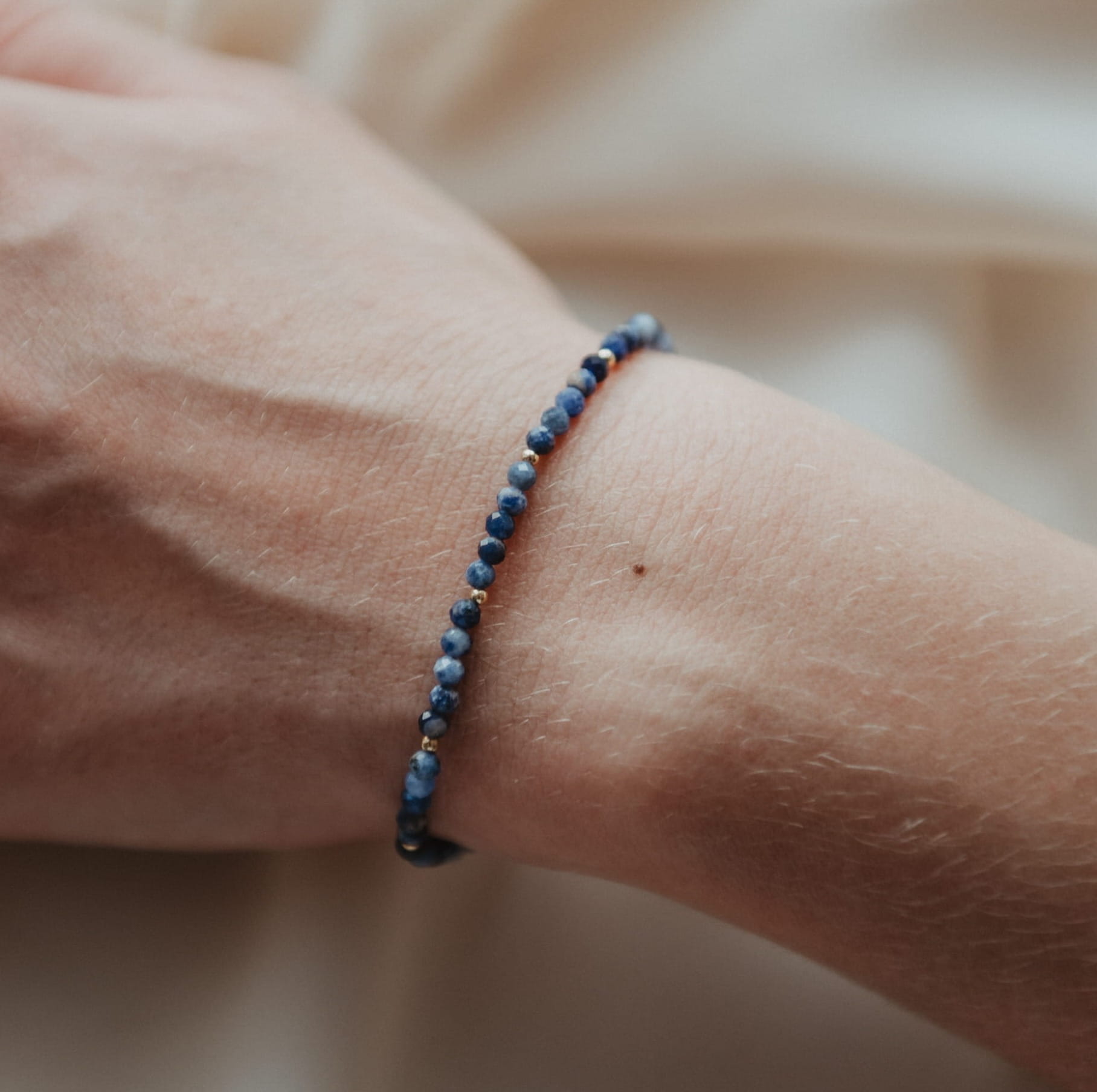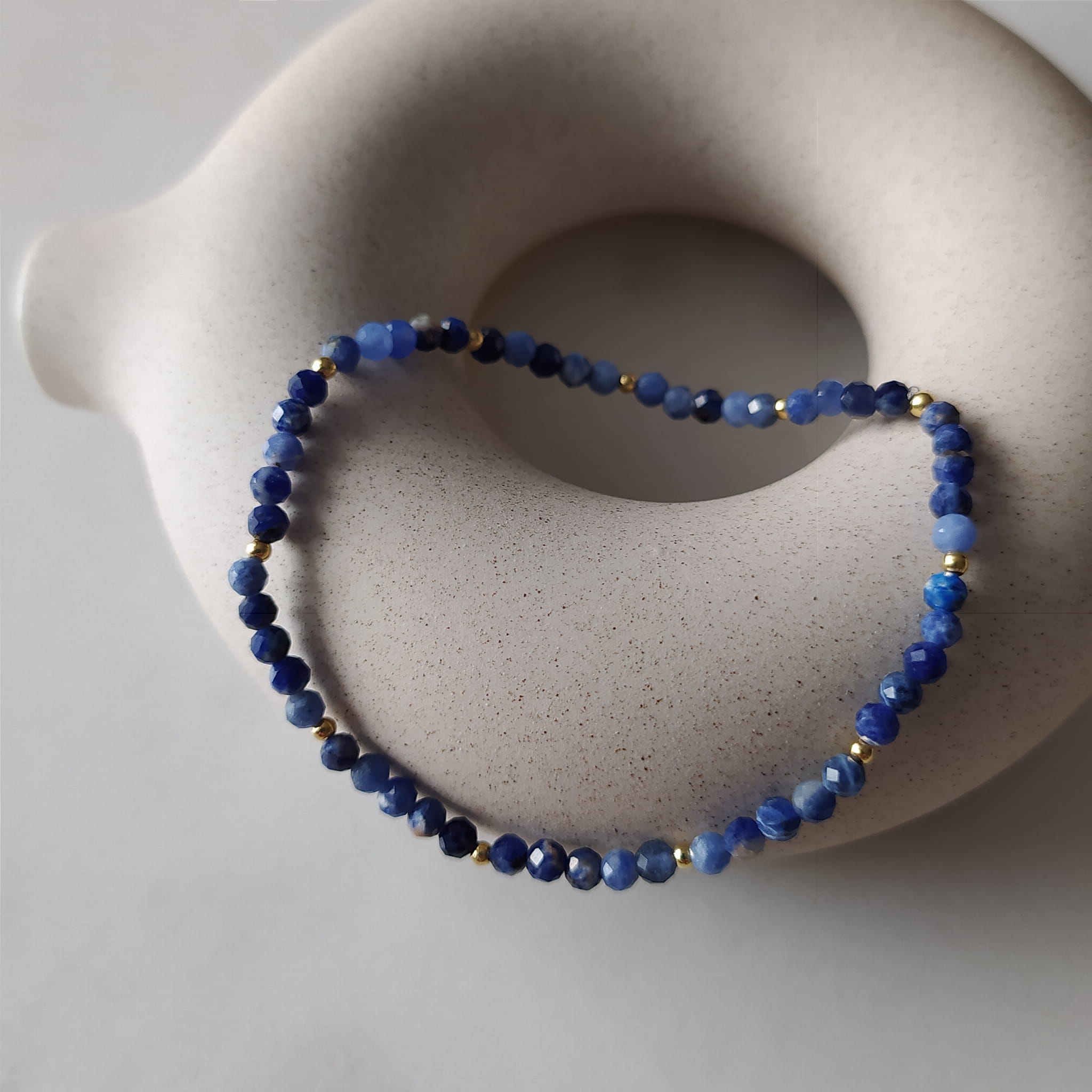 Klasyczna i minimalistyczna bransoletka z naturalnych sodalitów wielkości 3 mm w różnych odcieniach niebieskiego. Bransoletka na elastycznej gumce jubilerskiej. Pomiędzy kamieniami lśnią kuleczki ze srebra próby 925 pozłacanego 24-karatowym złotem.