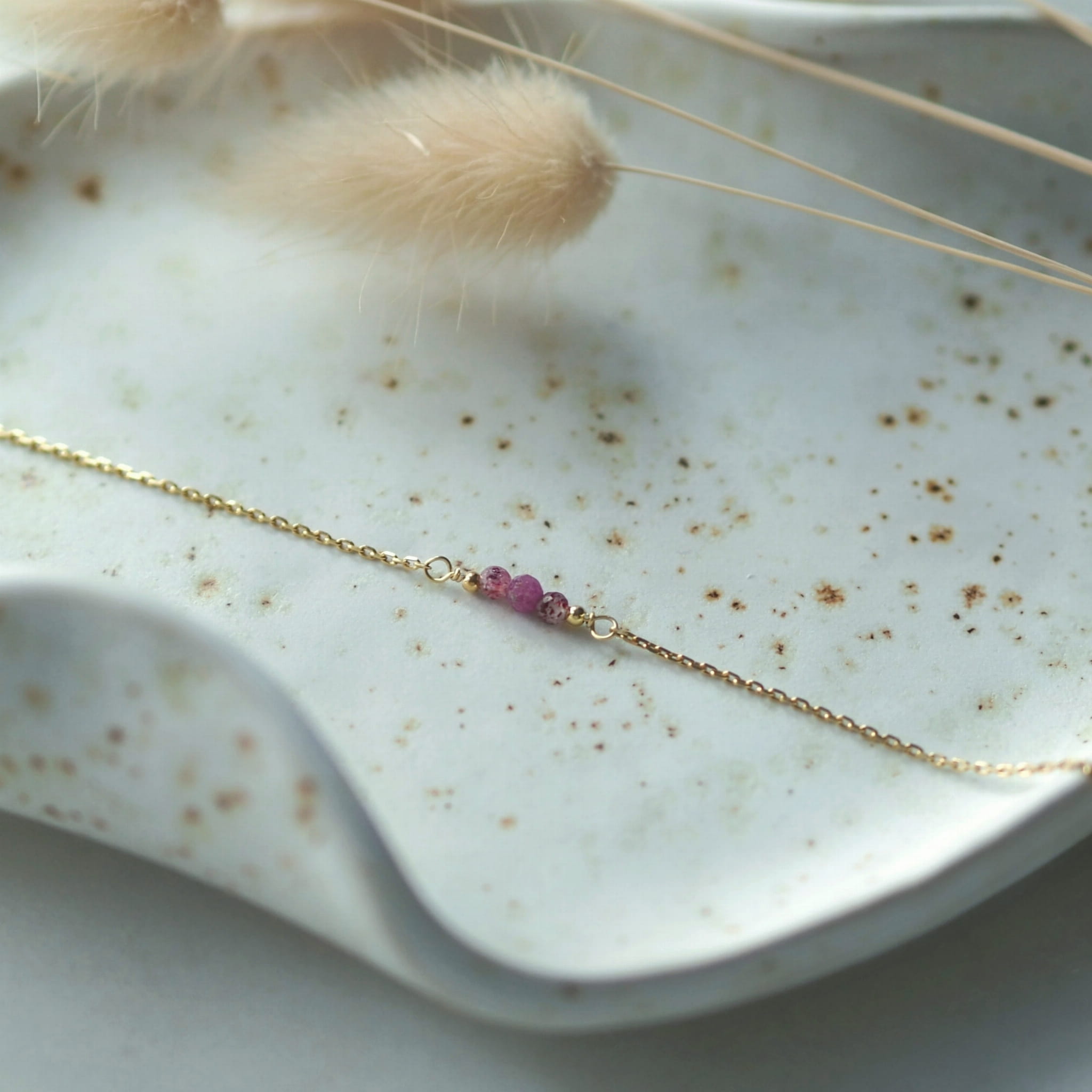 Bransoletka z najnowszej kolekcji L'amour na łańcuszku z przedłużką. Naturalne kamienie: kwarce truskawkowe (3 mm) i rubin (3 mm). Srebro próby 925 pozłacane 24-karatowym złotem. Długość bransoletki: 17 cm, długość przedłużki: 3 cm.