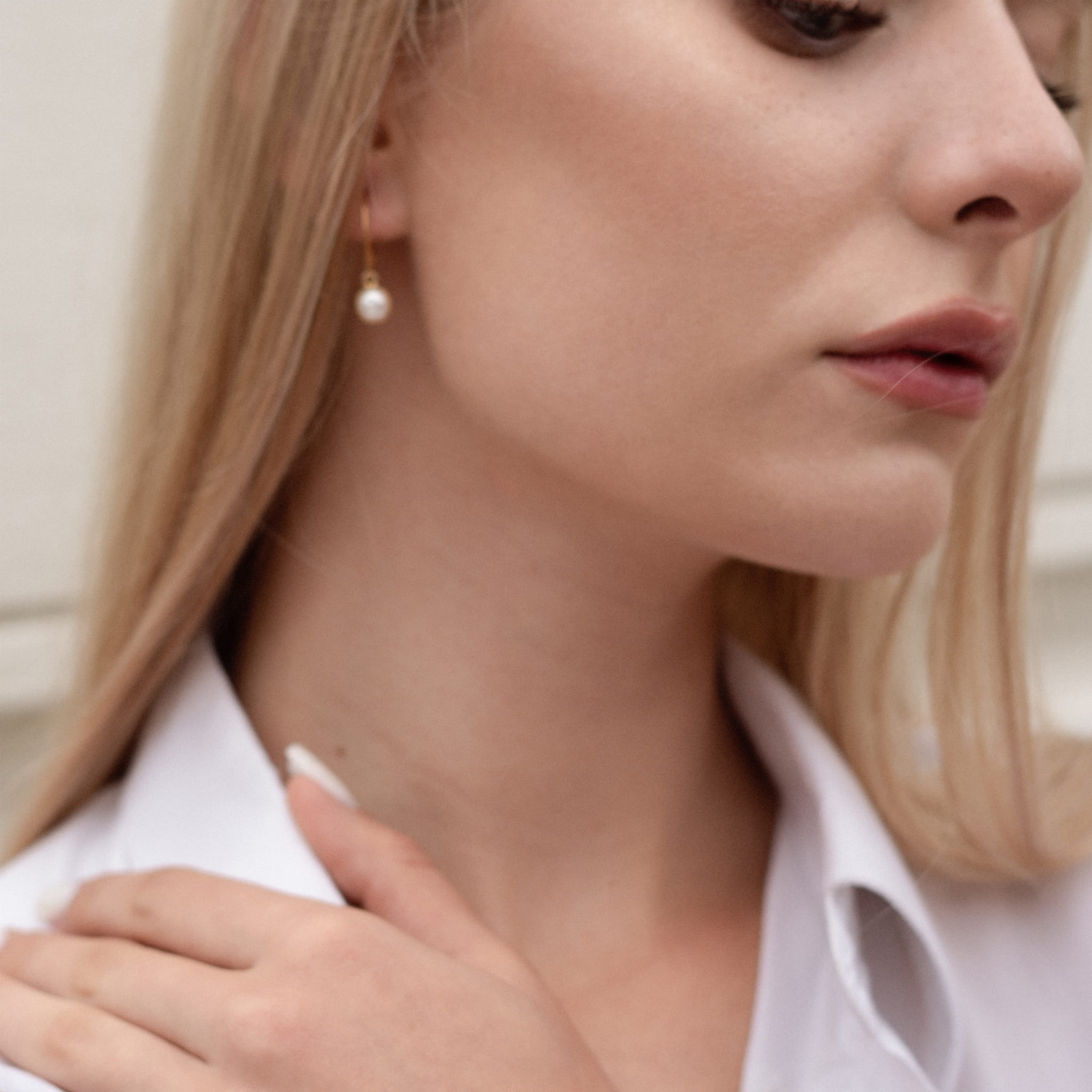 Eleganckie wiszące kolczyki, które idealnie sprawdzą się jako biżuteria ślubna, ale także jako dodatek do białej koszuli, czarnego swetra czy pudrowej sukienki. Kolczyki z białymi okrągłymi naturalnymi perłami w okuciu ze srebra złoconego próby 925. Średnica zawieszki - 7 mm. Pozostałe części wykonano również ze srebra pozłacanego próby 925.