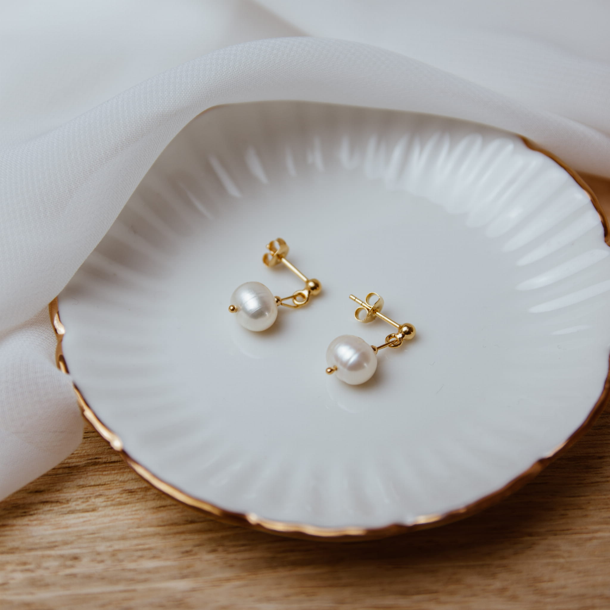 Wyrafinowane, klasyczne kolczyki na sztyft z dużymi perłami słodkowodnymi (7x9 mm) ze srebra próby 925 pozłacanego 24-karatowym złotem. Ponadczasowa klasyka. Wspaniale będzie wyglądać jako elegancki dodatek lub biżuteria ślubna.