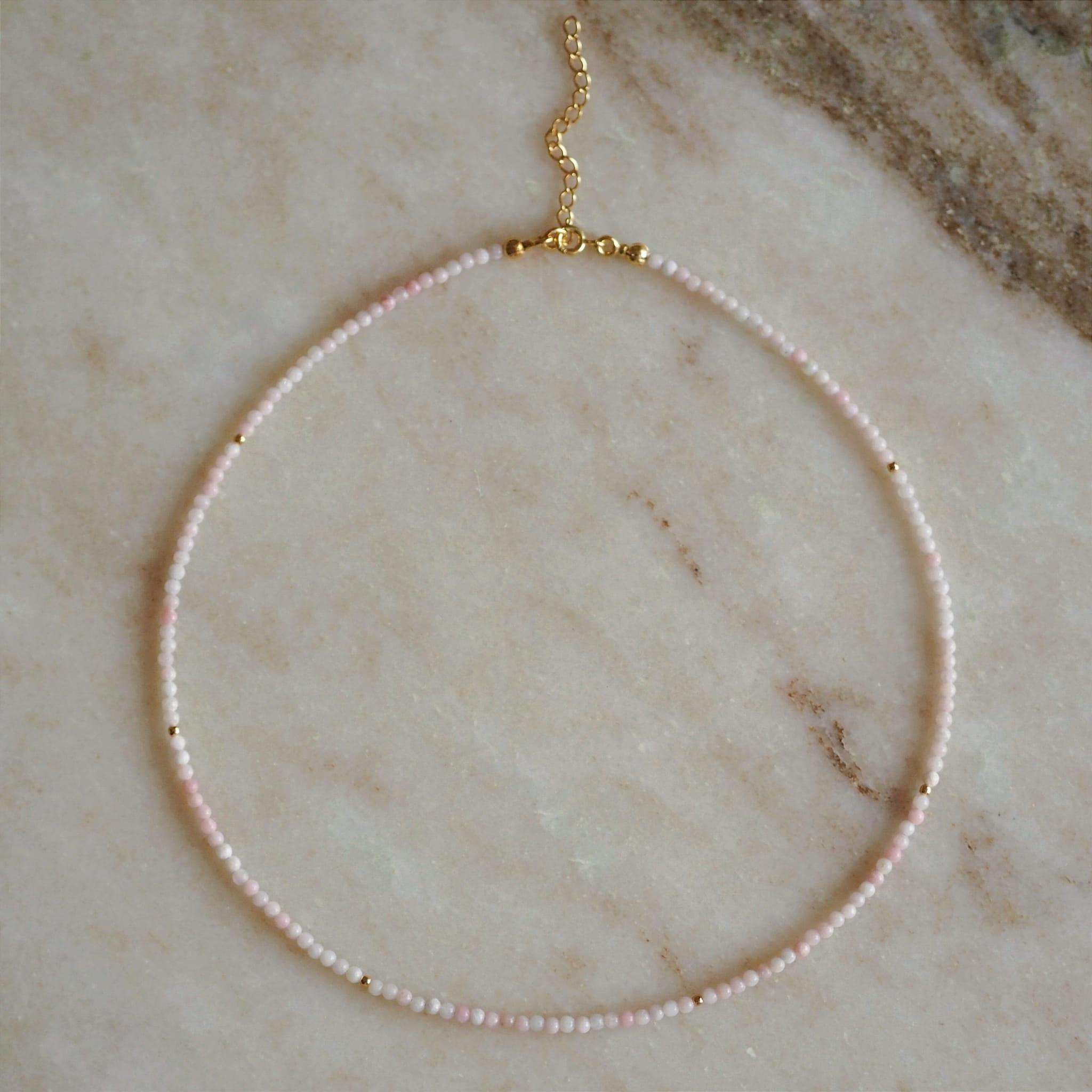 Naszyjnik z naturalnych opali (ok. 2 mm) i kuleczek ze srebra pozłacanego. Wykonany na mocnej lince jubilerskiej. Kamienie gładkie i jasne. Długość naszyjnika - 38 cm + 4 cm przedłużki. Możliwość wykonania krótszej lub dłuższej przedłużki lub naszyjnika bez przedłużki. Wszystkie elementy wykonano ze srebra próby 925 pozłacanego 24-karatowym złotem. Solidne końcówki przy zapięciu.