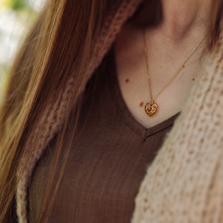 Ornamentowa, wręcz wiktoriańska struktura zawieszki spotka się z romantycznym kwarcem truskawkowym. Wisiorek w kształcie serca przyciąga spojrzenia misternym wykończeniem i subtelnym przepychem, który kojarzy się z biżuterią minionych epok. To drobiazg pełen klasy i elegancji — jakby wyjęty z rodzinnej szkatułki pełnej historii. To zestawienie szlachetnej formy i subtelnej barwy z charakternymi kropeczkami tworzy biżuterię, która nie tylko ozdabia, ale też mówi — o kobiecości, oryginalności i elegancji, która nie potrzebuje słów.