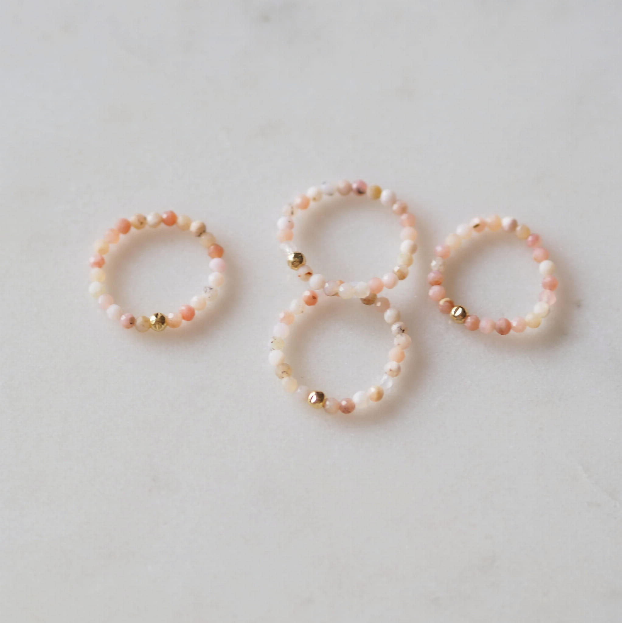 Uroczy i bardzo kobiecy pierścionek z naturalnymi opalami w różnych odcieniach. Kamienie fasetowane wielkości 2,5 mm. Młotkowana kulka wykonana ze srebra próby 925 pozłacanego 24-karatowym złotem. Pierścionek na elastycznej gumce jubilerskiej. Kamienie pięknie się mienią.