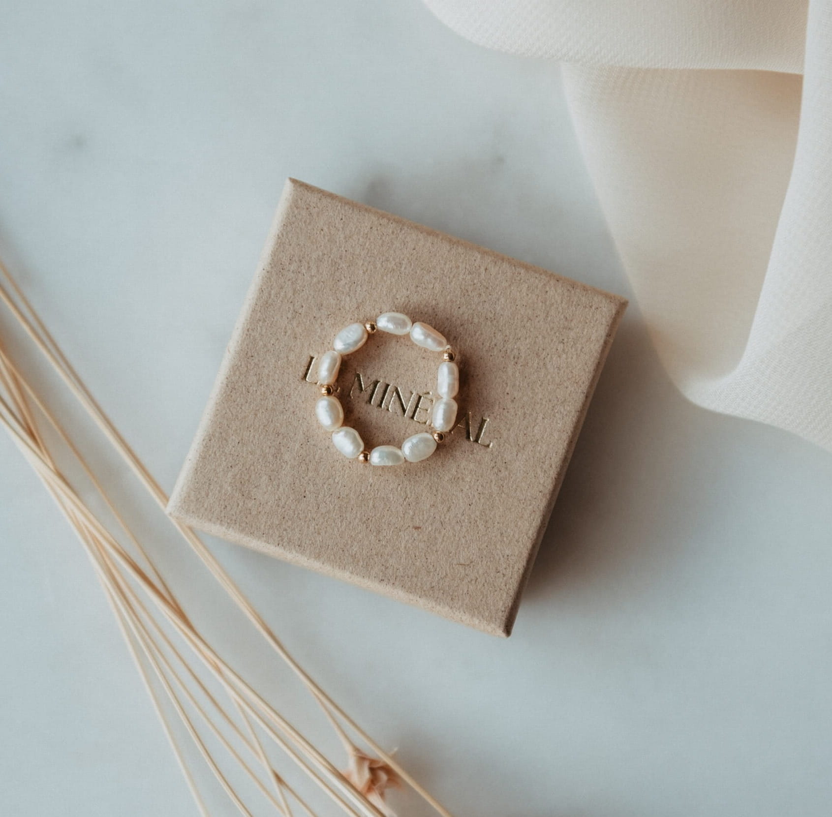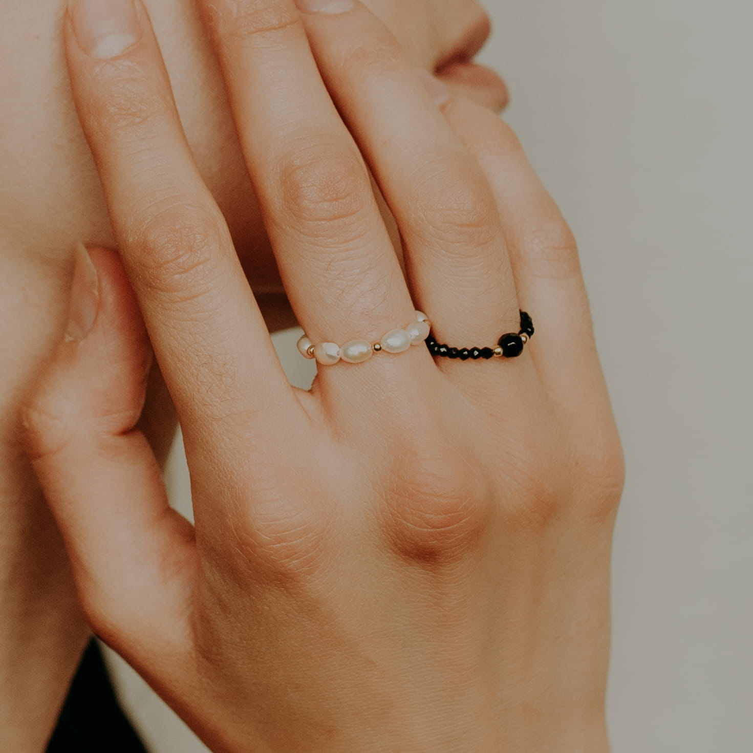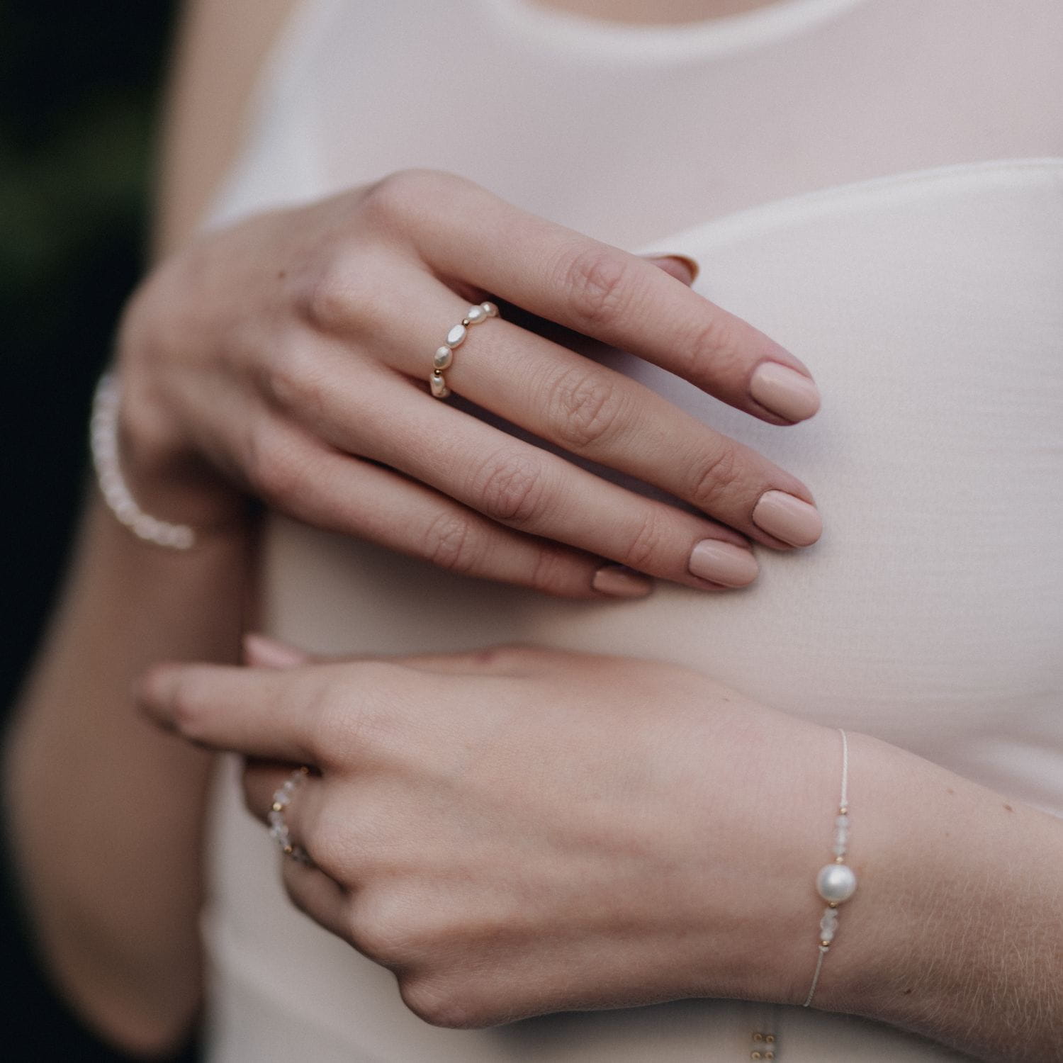 Elegancki pierścionek na gumce. Wykonany z naturalnych podłużnych pereł słodkowodnych oraz kuleczek ze srebra próby 925 pozłacanego 24-karatowym złotem. Sprawdzi się jako dodatek do jedwabnych bluzek oraz jako biżuteria ślubna.