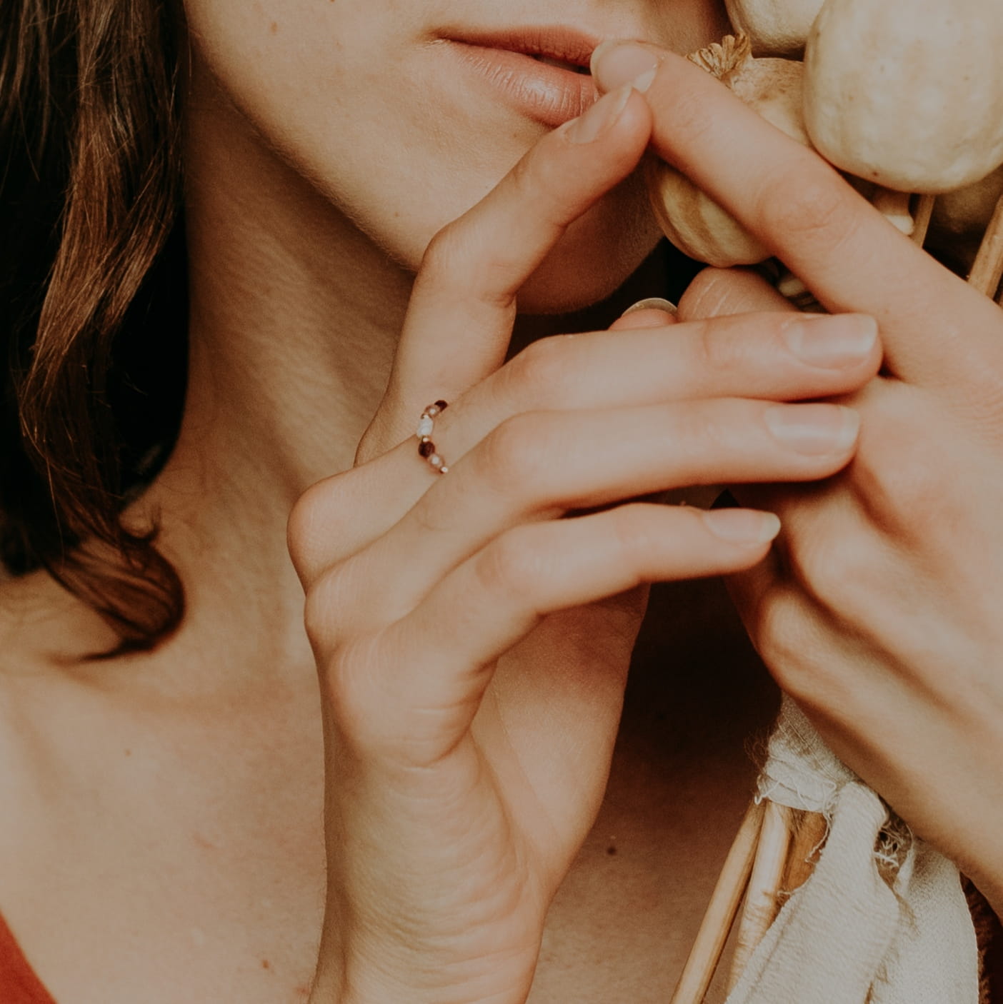 Pierścionek N°27 | kw. truskawkowy, granat, perła, k. księżycowy