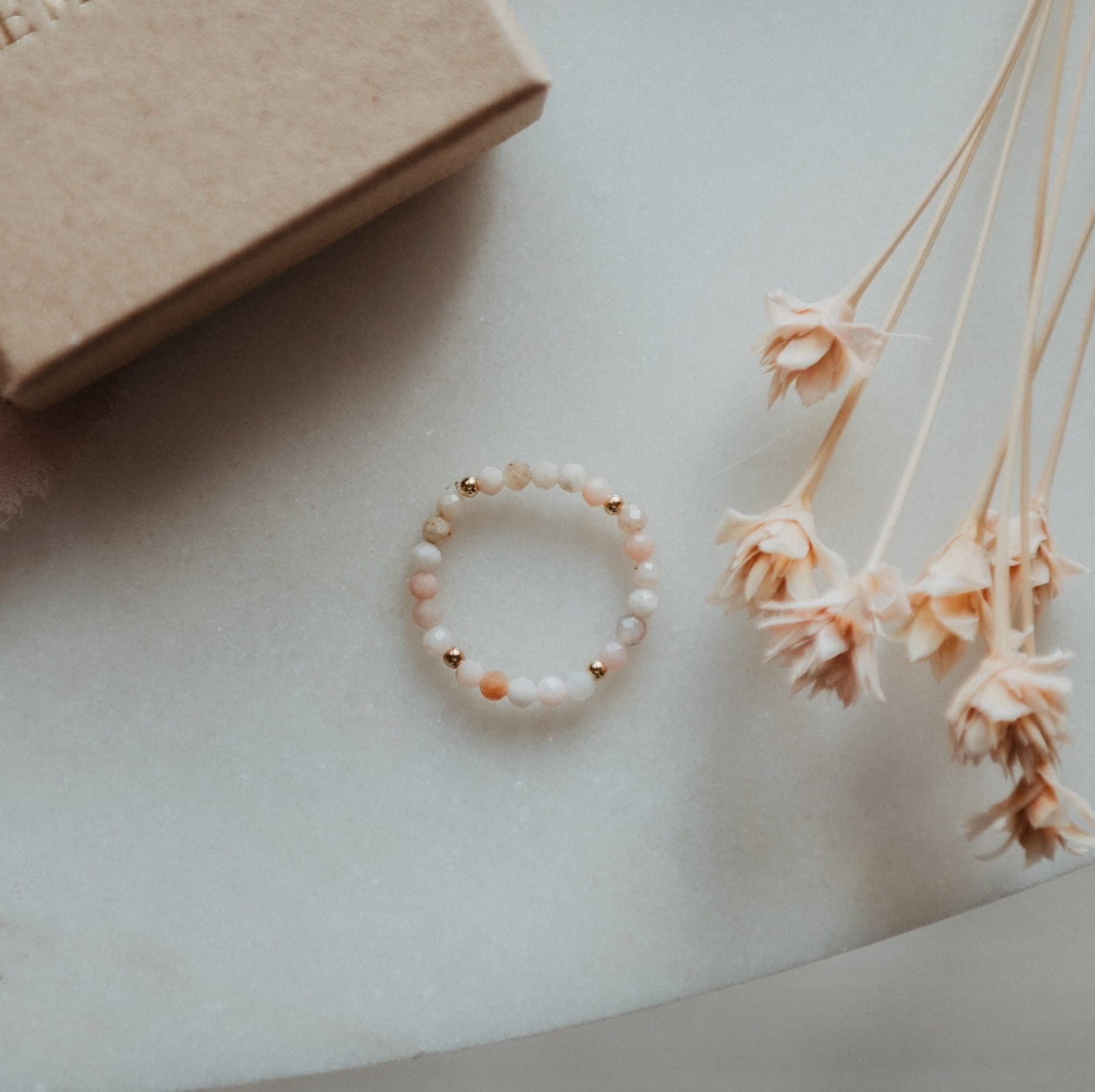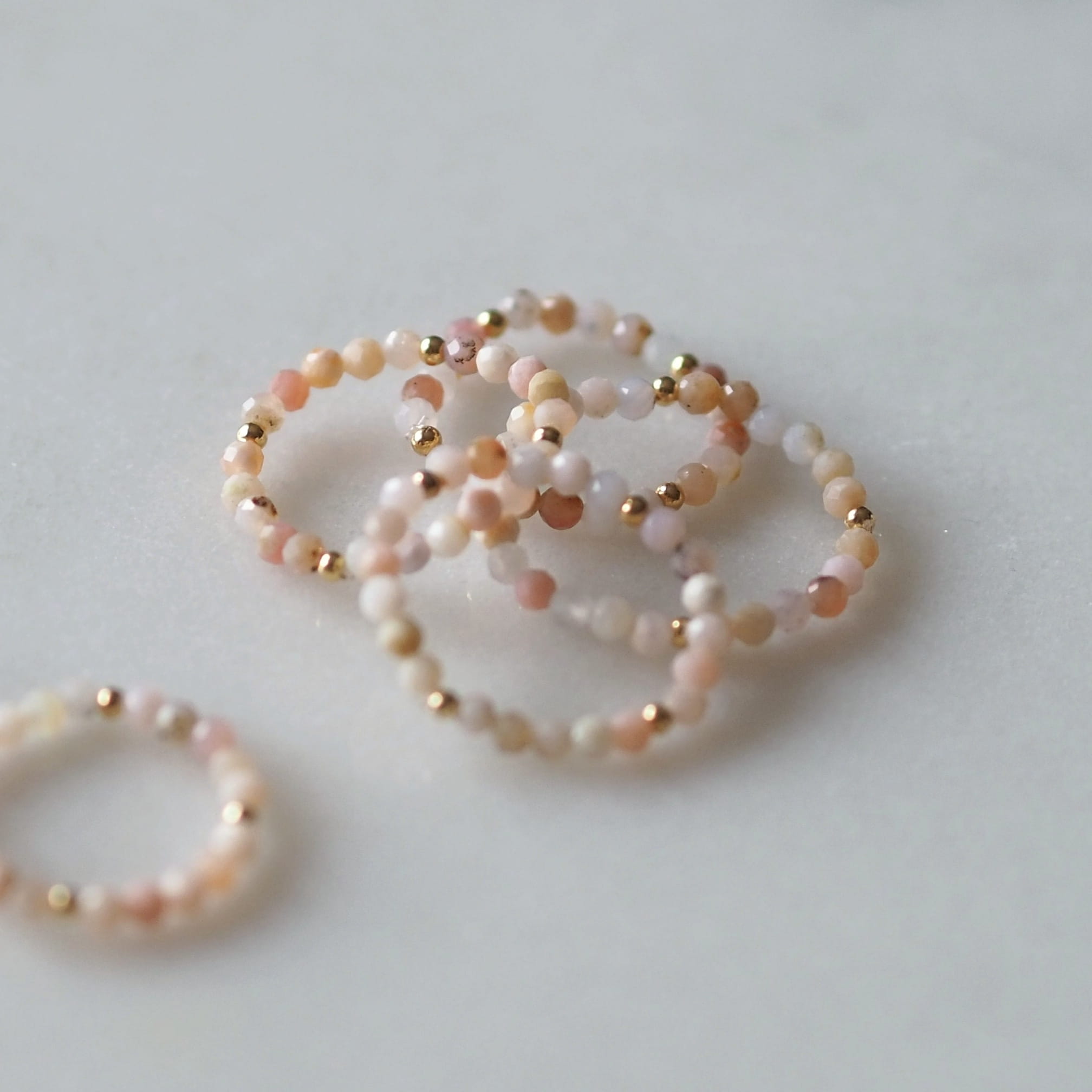 Pierścionek na gumce z naturalnych opali w kolorach delikatnego różu i beżu, przeplatany 4 kuleczkami ze srebra próby 925 pozłacanego 24-karatowym złotem. Wielkość kamieni - 2,5 mm.