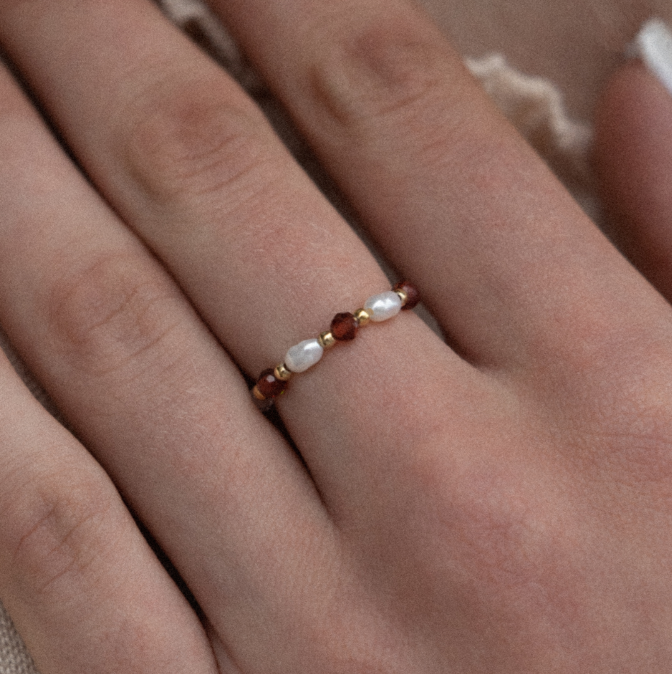 Pierścionek N°43 | kamień księżycowy, perła, granat