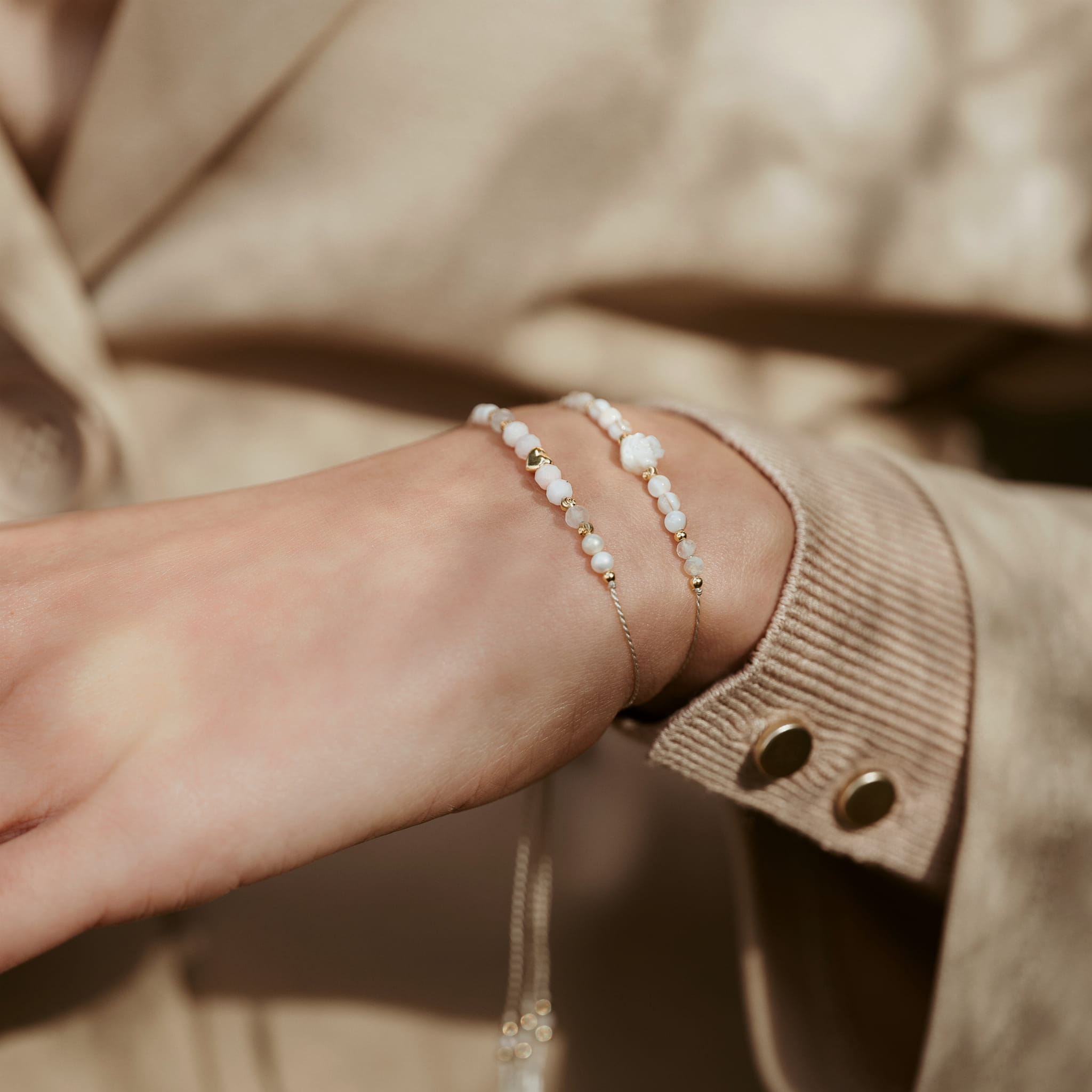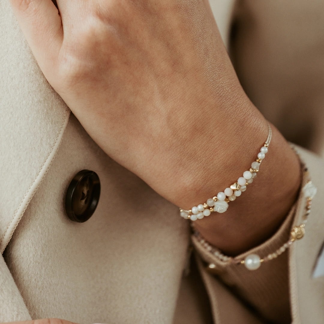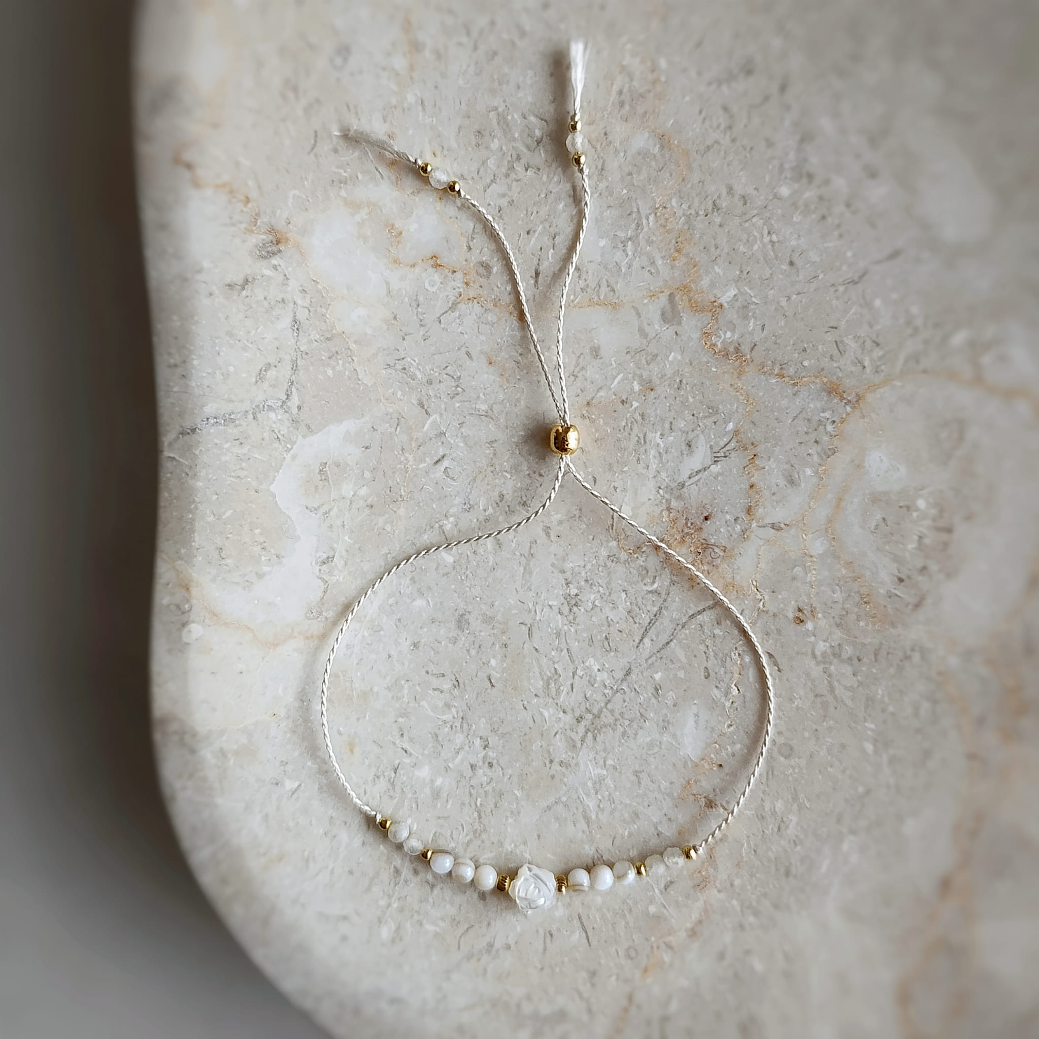 Ta wyjątkowa bransoletka powstała z myślą o kobietach, które cenią ponadczasową prostotę w szlachetnym wydaniu. Delikatny, jasnozłoty cytryn, masa perłowa i precyzyjnie wyrzeźbiona róża z masy perłowej dodają kompozycji romantycznego, kobiecego charakteru. To nie tylko ozdoba — to czuły manifest kobiecości, łagodności i wewnętrznego piękna. Bransoletka z naturalnymi cytrynami oraz masą perłową w odcieniach bieli, brązu i beżu. Wykonana na jedwabnej nici w kolorze kości słoniowej. Kuleczki oraz stoper wykonano ze srebra próby 925 pozłacanego 24-karatowym złotem.