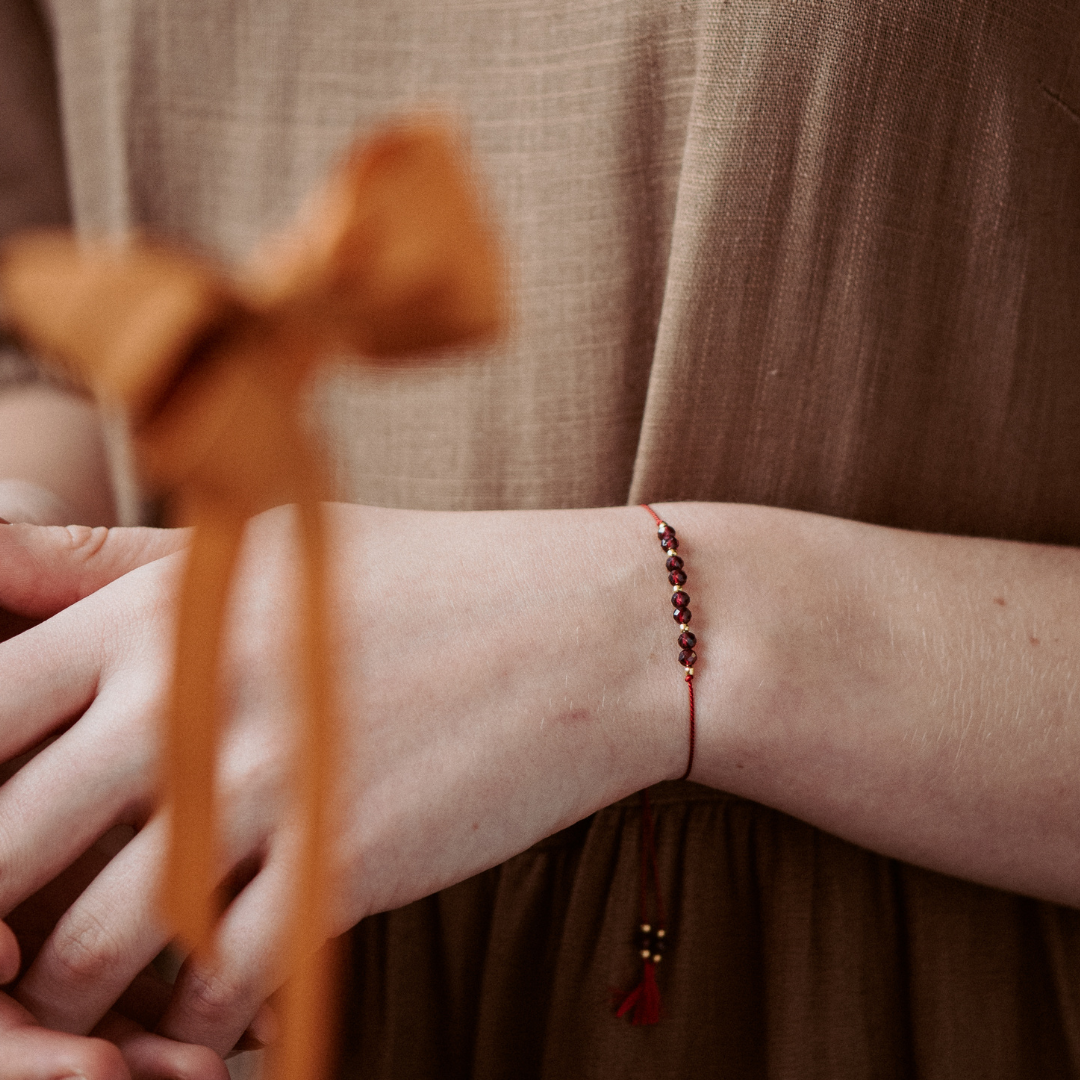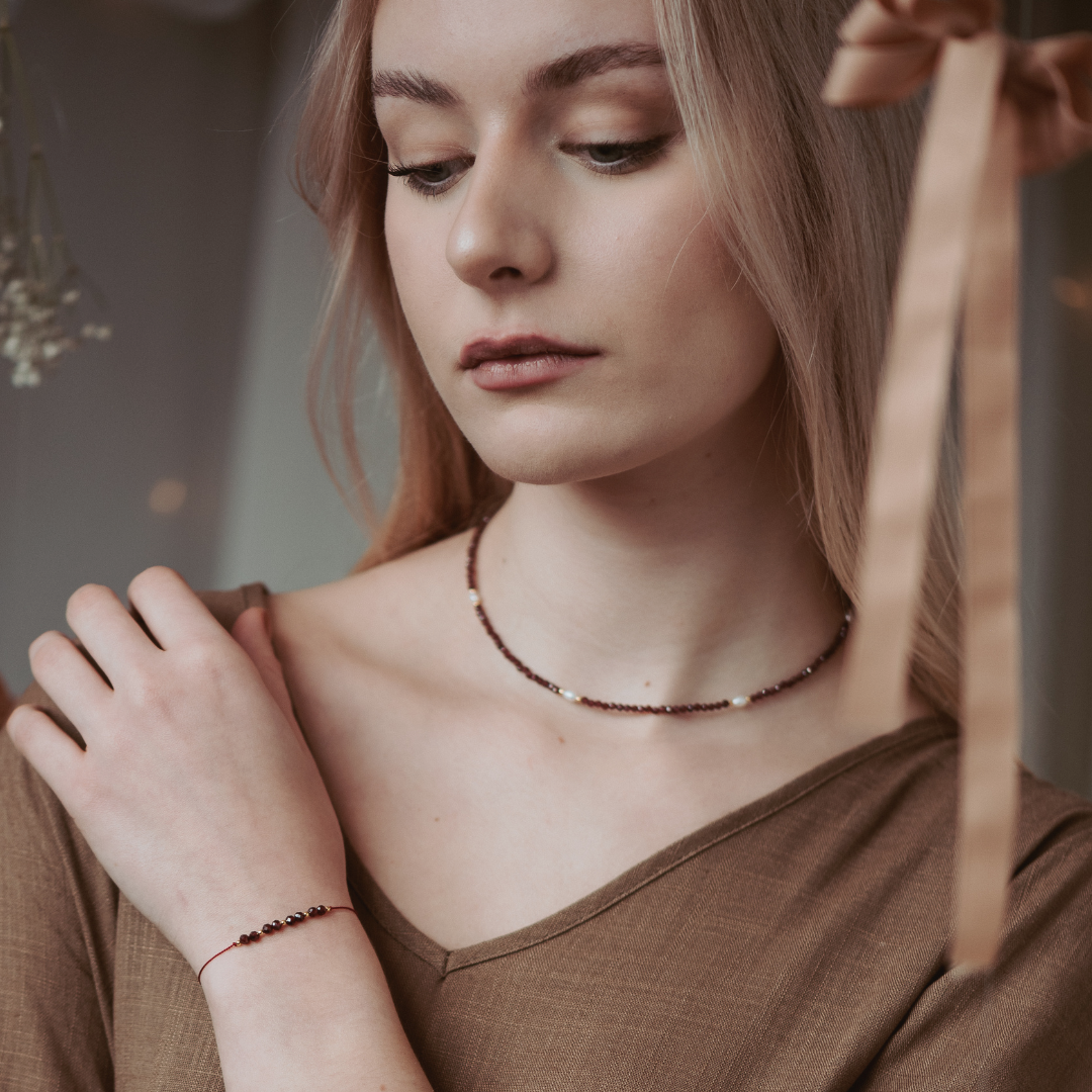 Bransoletka z naturalnych granatów. Wielkość kamieni: 3 mm. Kuleczki oraz stoper ze srebra próby 925 pozłacanego 24-karatowym złotem. Całość na bordowej, jedwabnej nici.