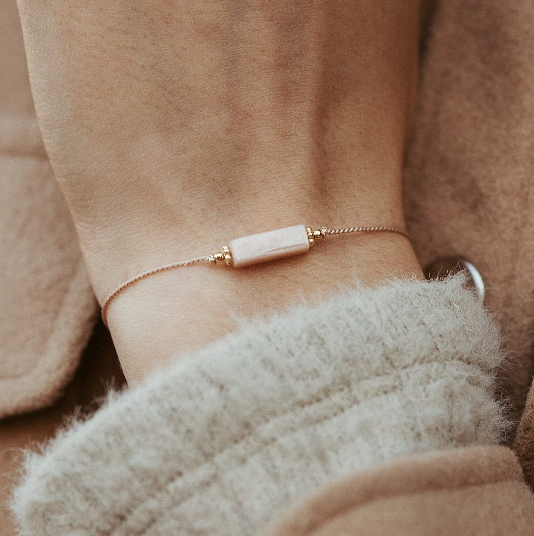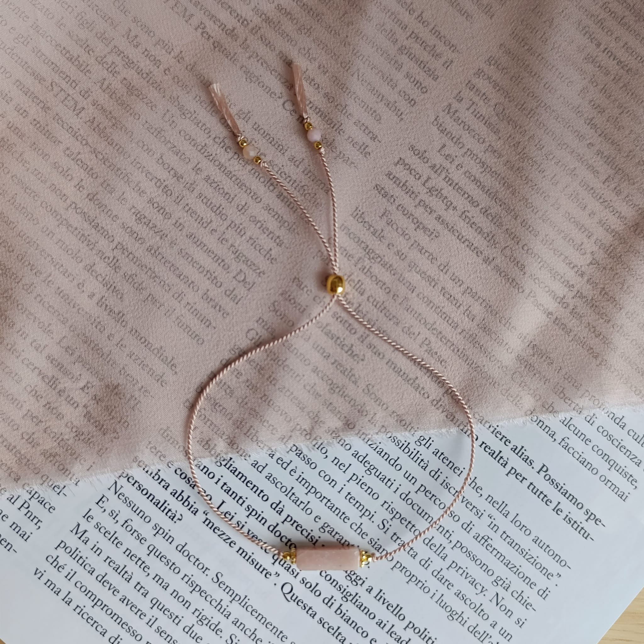 Minimalistyczna bransoletka z naturalnymi opalami. Wielkość kamieni: 3 mm na końcach, kamień centralny: ok. 1,3 cm długości. Kuleczki oraz regulacyjny stoper ze srebra próby 925 pozłacanego 24-karatowym złotem. Całość na jedwabnej, pudrowej nici.