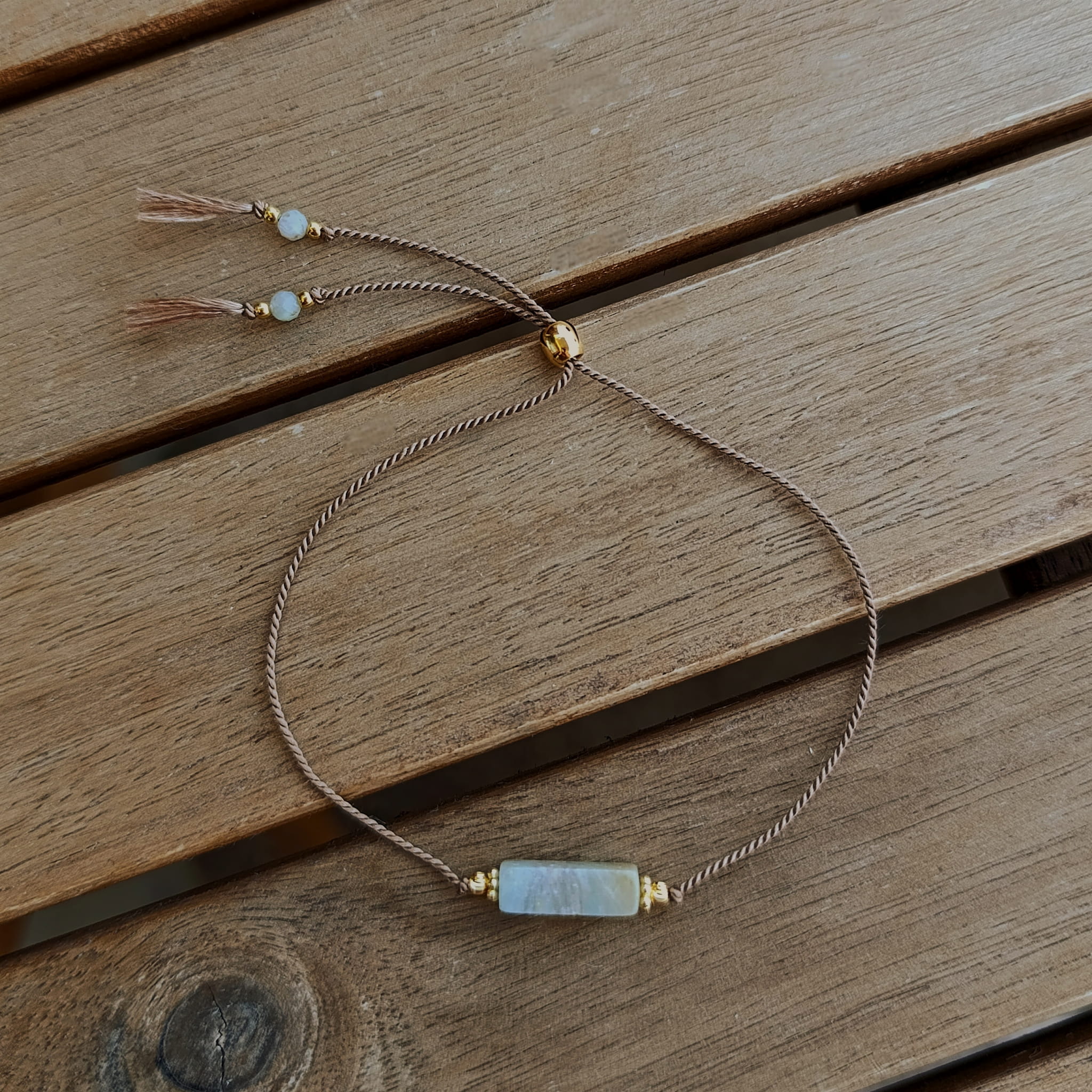 Bardzo subtelna bransoletka z naturalnego amazonitu. Długość patyczka: ok. 1,3 cm. Kamieniom towarzyszą kuleczki i przekładki ze srebra pozłacanego. Całość na jasnobrązowej, jedwabnej nici. Złote elementy wykonano ze srebra próby 925 pozłacanego 24-karatowym złotem.