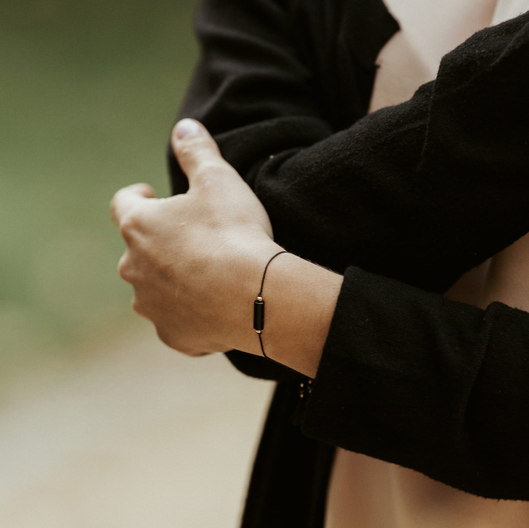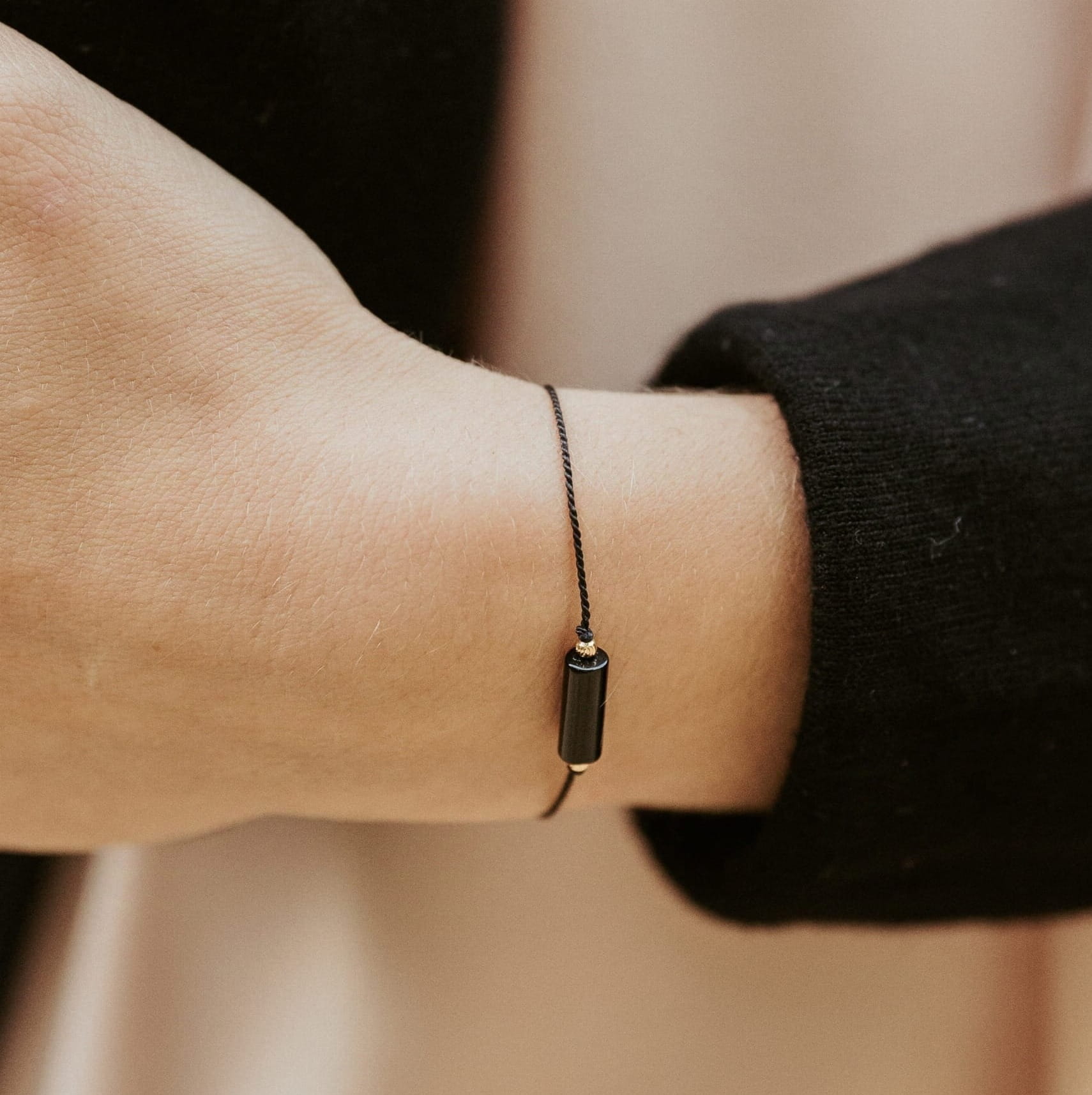 Klasyczna i minimalistyczna bransoletka z naturalnych czarnych onyksów (średnica kamieni na końcach: 3 mm) na jedwabnej czarnej nici. Kuleczki pomiędzy kamieniami i na końcówkach oraz stoper wykonano ze srebra próby 925 pozłacanego 24-karatowym złotem.