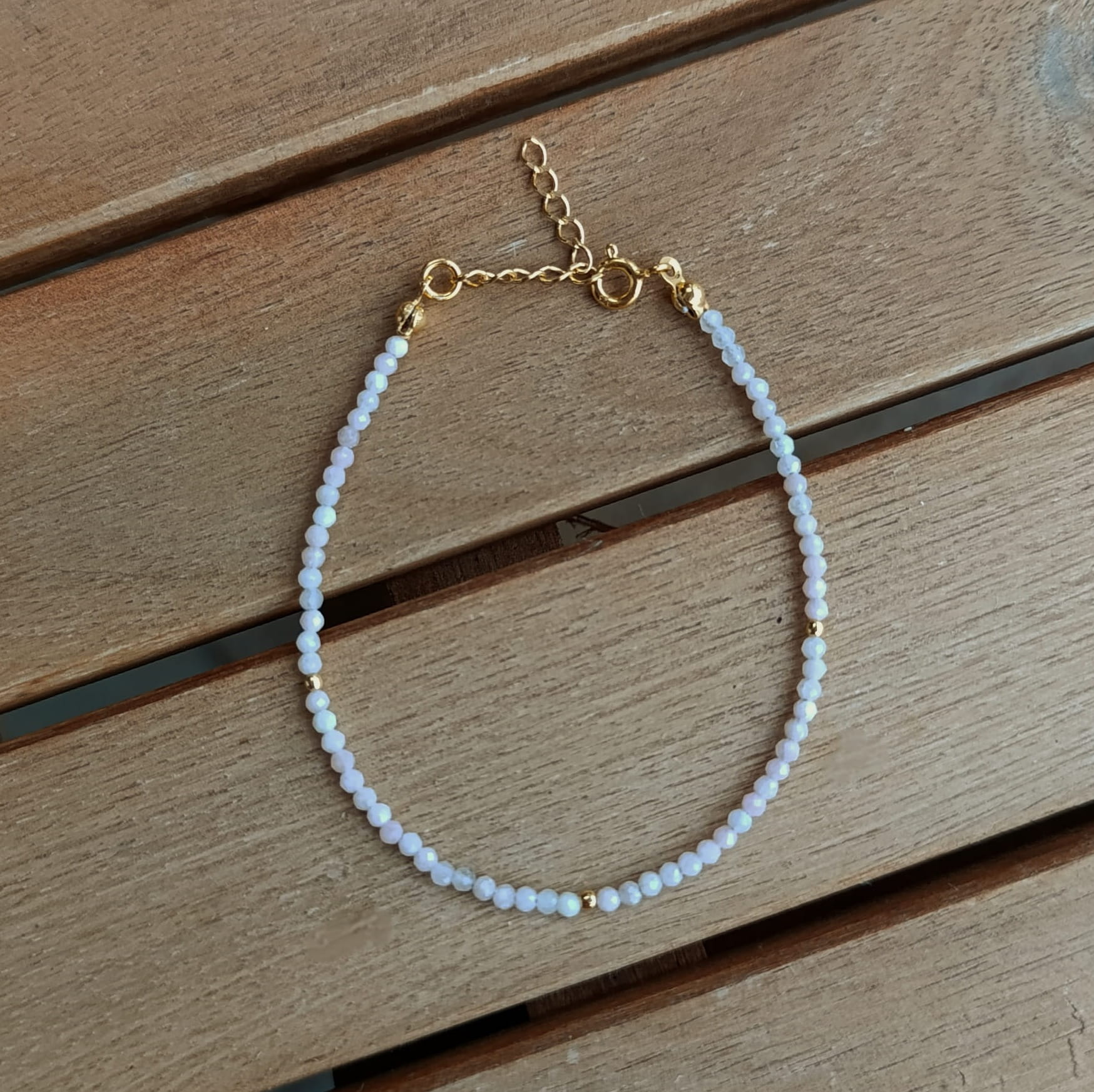 Delikatna bransoletka z naturalnych, jasnych opali, które dzięki odpowiedniemu szlifowi pięknie się mienią. Złote elementy ze srebra próby 925 pozłacanego 24-karatowym złotem. Mocna linka jubilerska oraz solidne końcówki przy zapięciu. Długość - 17 cm (+3 cm przedłużki).