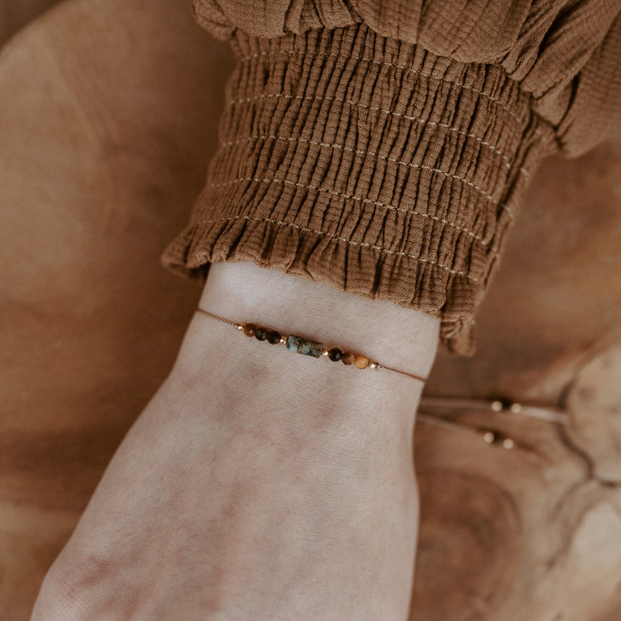 Bransoletka z naturalnych kamieni: turkusu oraz gładkiego tygrysiego oka. Całość na jasnobrązowej nici jedwabnej. Kuleczki, przekładki i stoper wykonano ze srebra próby 925 pozłacanego 24-karatowym złotem.