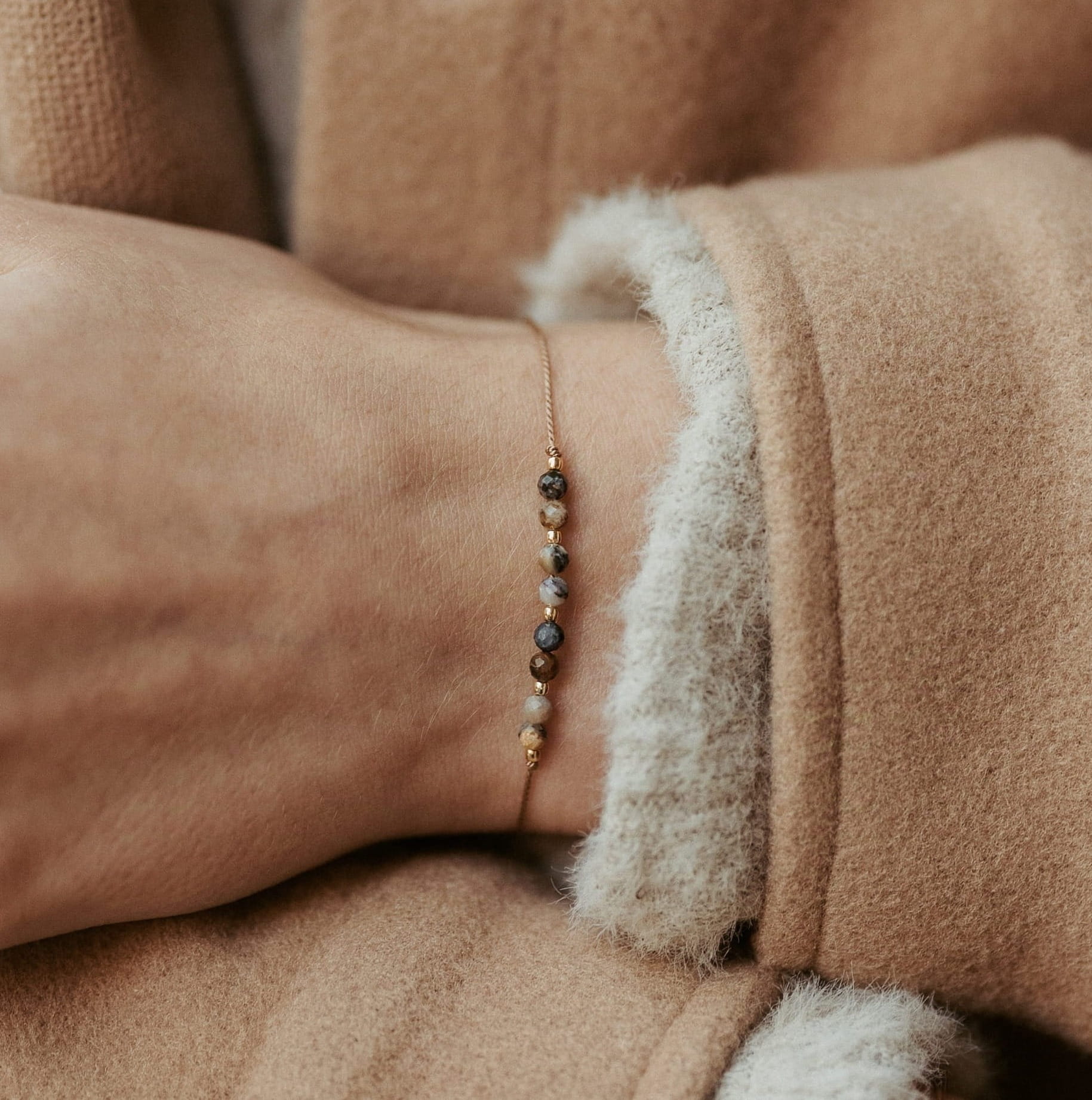 Bransoletka z naturalnych opali peruwiańskich w ciemnych odcieniach. Rozmiar kamieni: 3 mm. Kamienie fasetowane, w przeważających kolorach brązu i czerni. Kuleczki oraz stoper ze srebra próby 925 pozłacanego 24-karatowym złotem. Całość na jasnobrązowej jedwabnej nici.