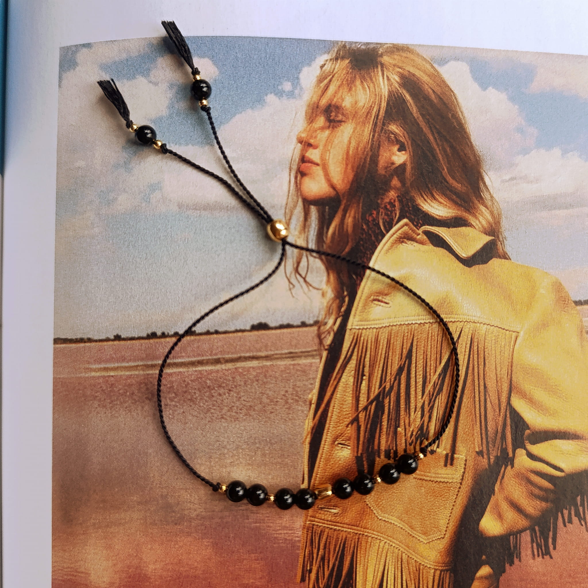 Oryginalna bransoletka z naturalnych czarnych onyksów (średnica kamieni: 4 mm) na jedwabnej czarnej nici. Pośrodku ciekawy element w postaci nieregularnej bryłki. Elegancka i ponadczasowa. Kuleczki, ozdobny element oraz stoper wykonano ze srebra próby 925 pozłacanego 24-karatowym złotem.