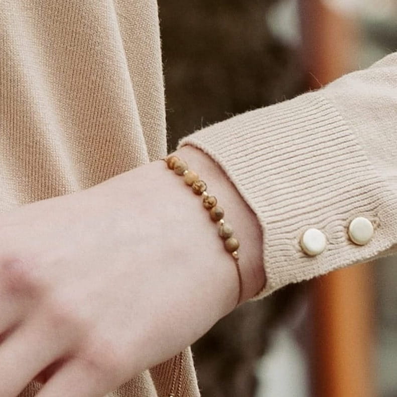Wyrazista bransoletka z naturalnymi, gładkimi jaspisami obrazkowymi w różnych odcieniach: brązu i beżu. Wielkość kamieni: 4,5 mm. Kuleczki oraz stoper ze srebra próby 925 pozłacanego 24-karatowym złotem. Całość nawleczona na jedwabną, jasnobrązową nić. Eleganckie chwosty na końcach.