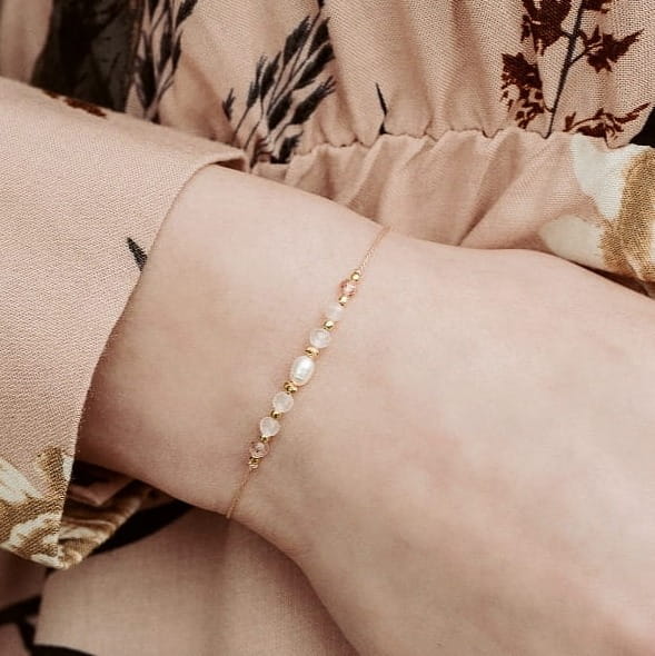 Połączenie różowych kamieni kwarcu truskawkowego i różowego kwarcu z transparentnym kamieniem księżycowym oraz perłą hodowaną. Całość na pudrowej, jedwabnej nici z kuleczkami i regulacją ze srebra próby 925 pozłacanego 24-karatowym złotem.