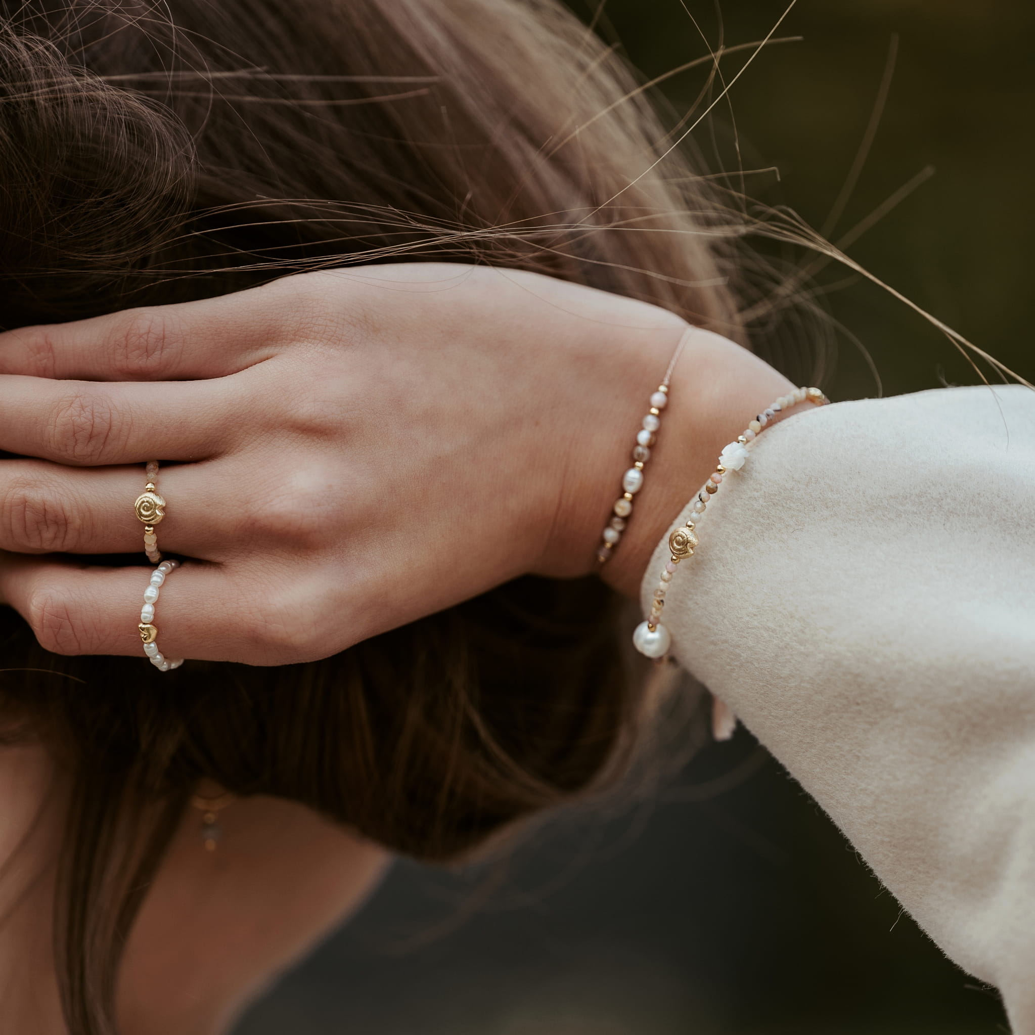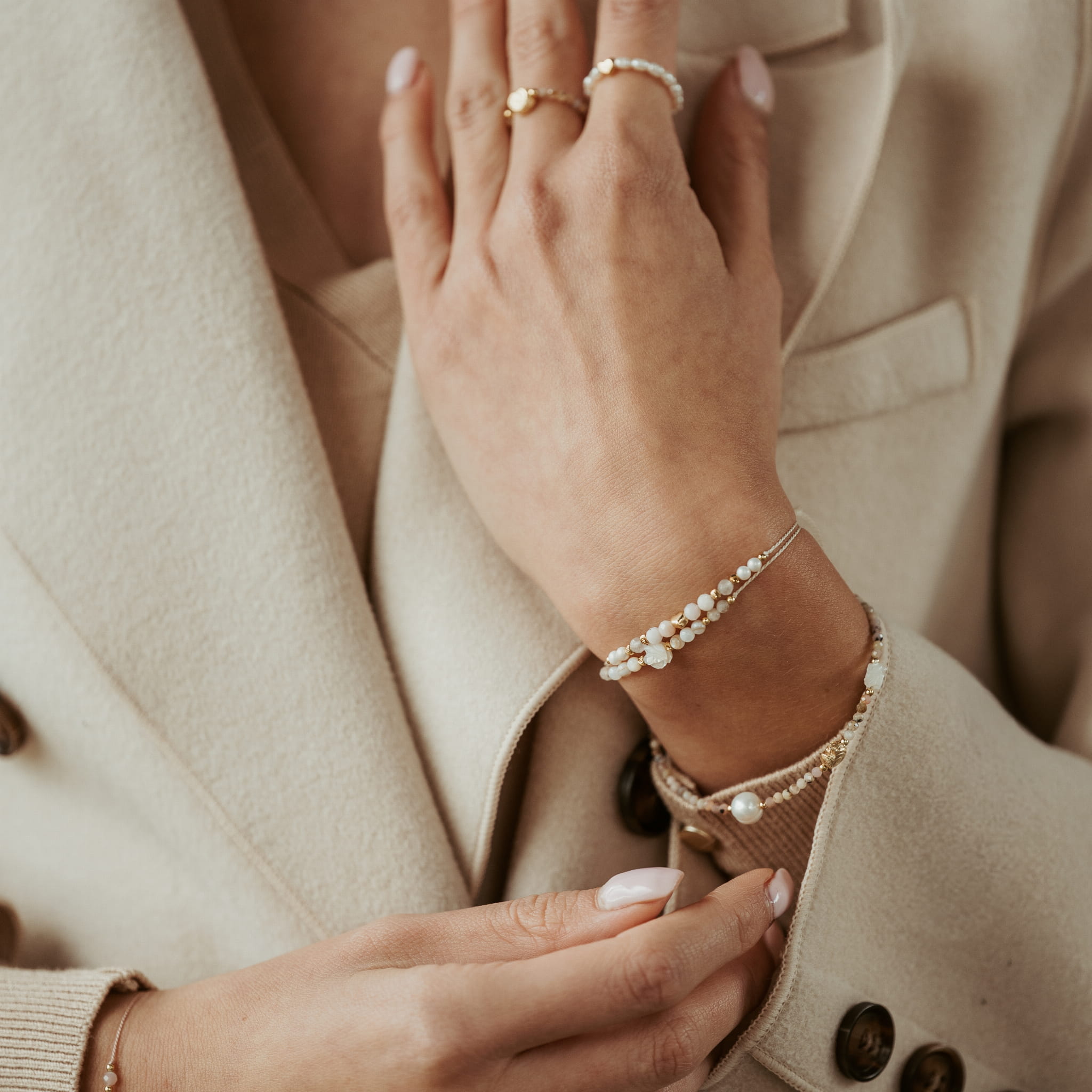 Bransoletka na mocnej lince jubilerskiej ze srebra próby 925 pozłacanego 24-karatowym złotem. Fasetowane, naturalne opale peruwiańskie (średnica kamieni: 2,5 mm), naturalna perła i kwiatek z masy perłowej. Solidne końcówki przy zapięciu. Długość - 17 cm (+3 cm przedłużki).