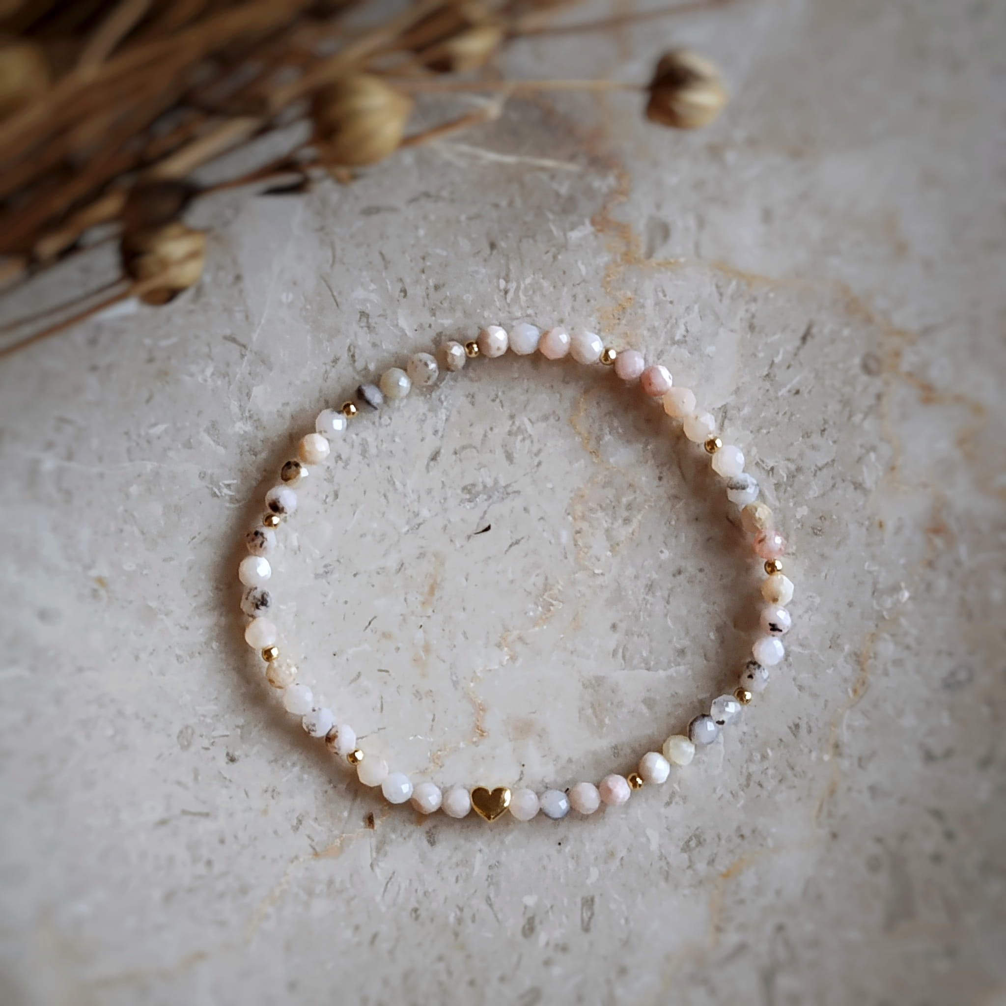 Bransoletka na gumce z naturalnych opali peruwiańskich w różnych odcieniach z delikatnym, romantycznym akcentem w postaci serduszka.