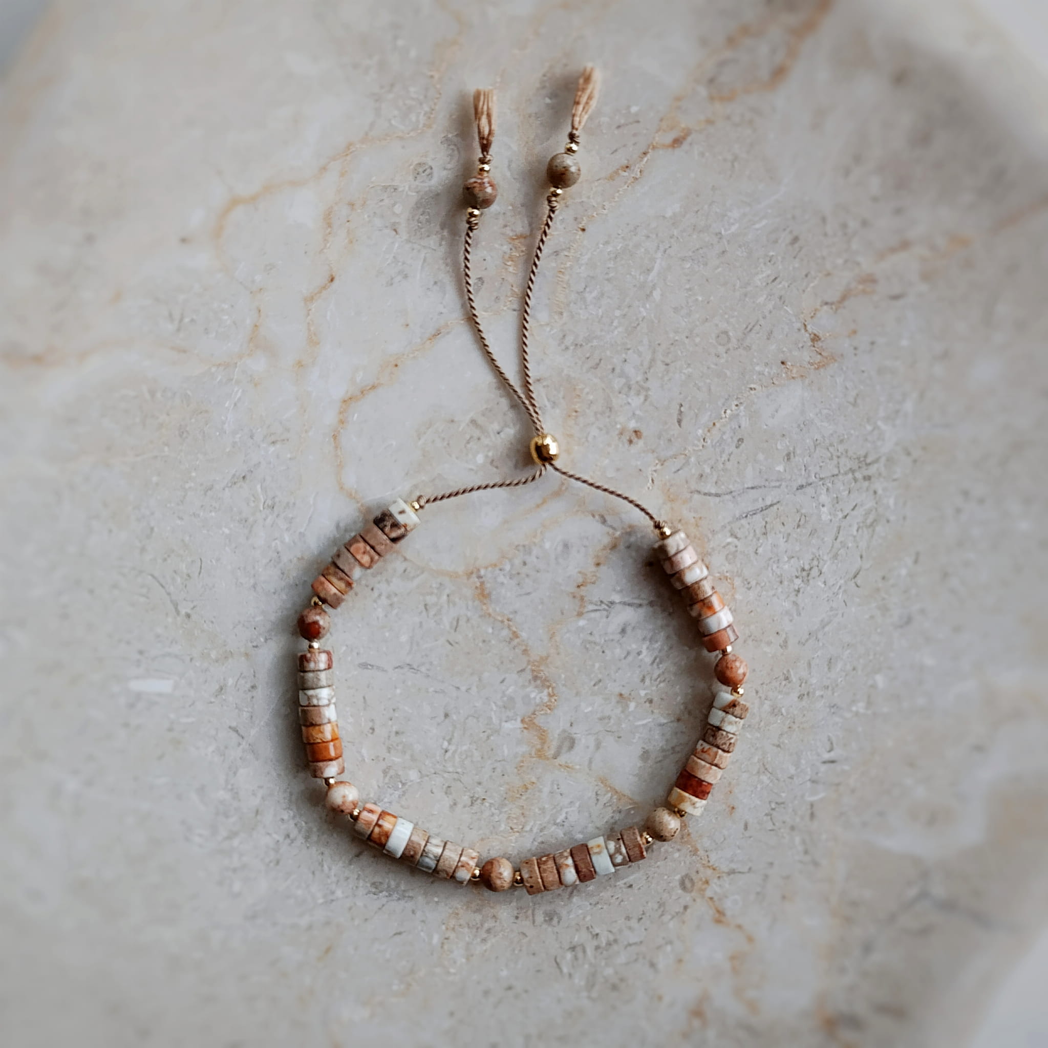 Bransoletka Pumpkin Latte to wyjątkowa kompozycja jaspisów w odcieniach kawy z mlekiem, dyni i rozgrzewających przypraw. Nasycone barwy ziemi przywołują skojarzenia z ulubionym kubkiem latte wypitym w miękkim swetrze, przy oknie z widokiem na spadające liście. Każdy kamień jest inny — jak odcienie jesieni, które zmieniają się z dnia na dzień.