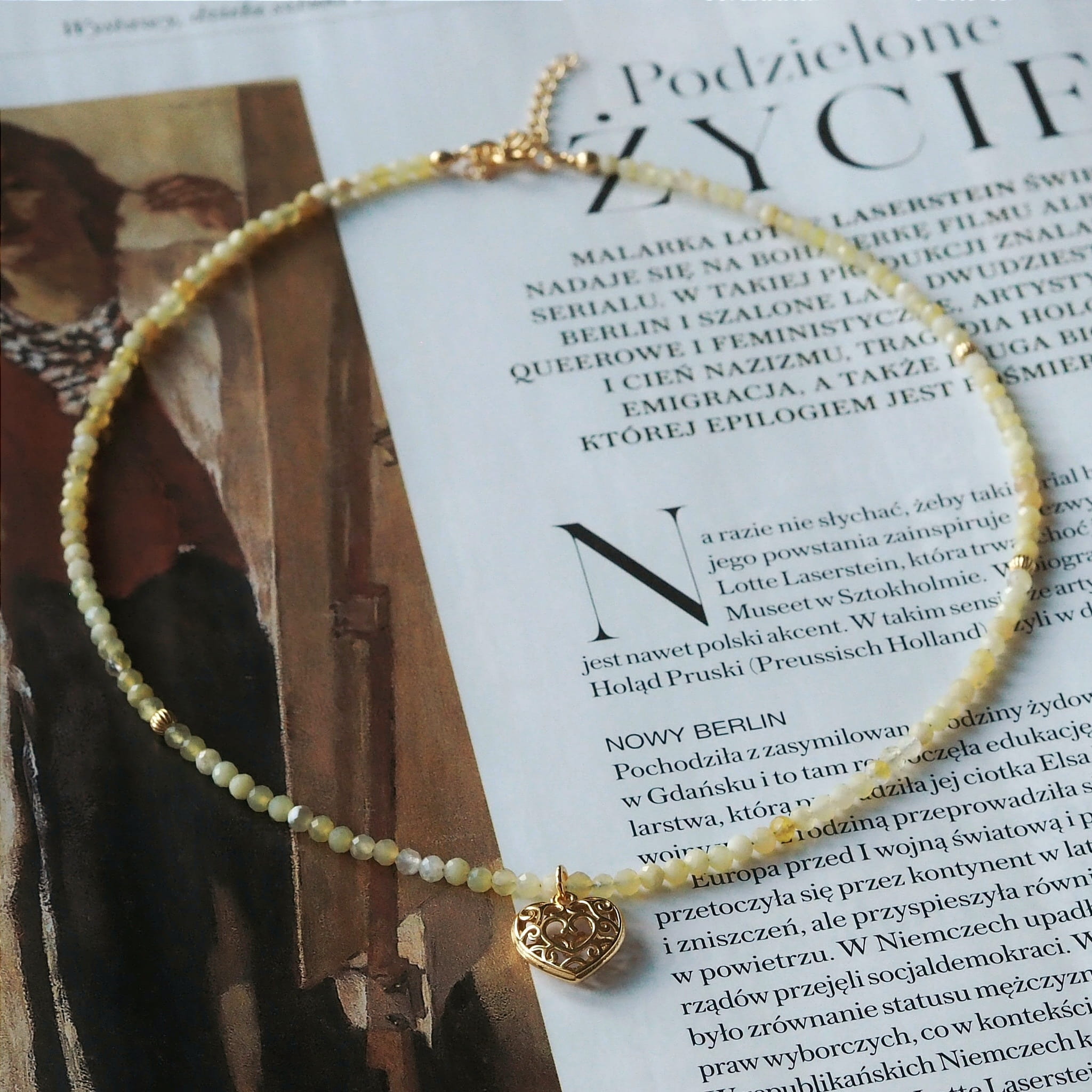 Modny naszyjnik z najnowszej kolekcji YOUNG wykonany z naturalnych opali żółtych (średnica około 2,5 mm), trzech ozdobnych kuleczek oraz zawieszki w kształcie ażurowego serca. Wykonany ze srebra próby 925 pozłacanego 24-karatowym złotem, na mocnej lince jubilerskiej. Kamienie pięknie się mienią. Solidne końcówki przy zapięciu. Długość: 38 cm + 4 cm przedłużki. Możliwość wykonania krótszej lub dłuższej przedłużki lub naszyjnika bez przedłużki.