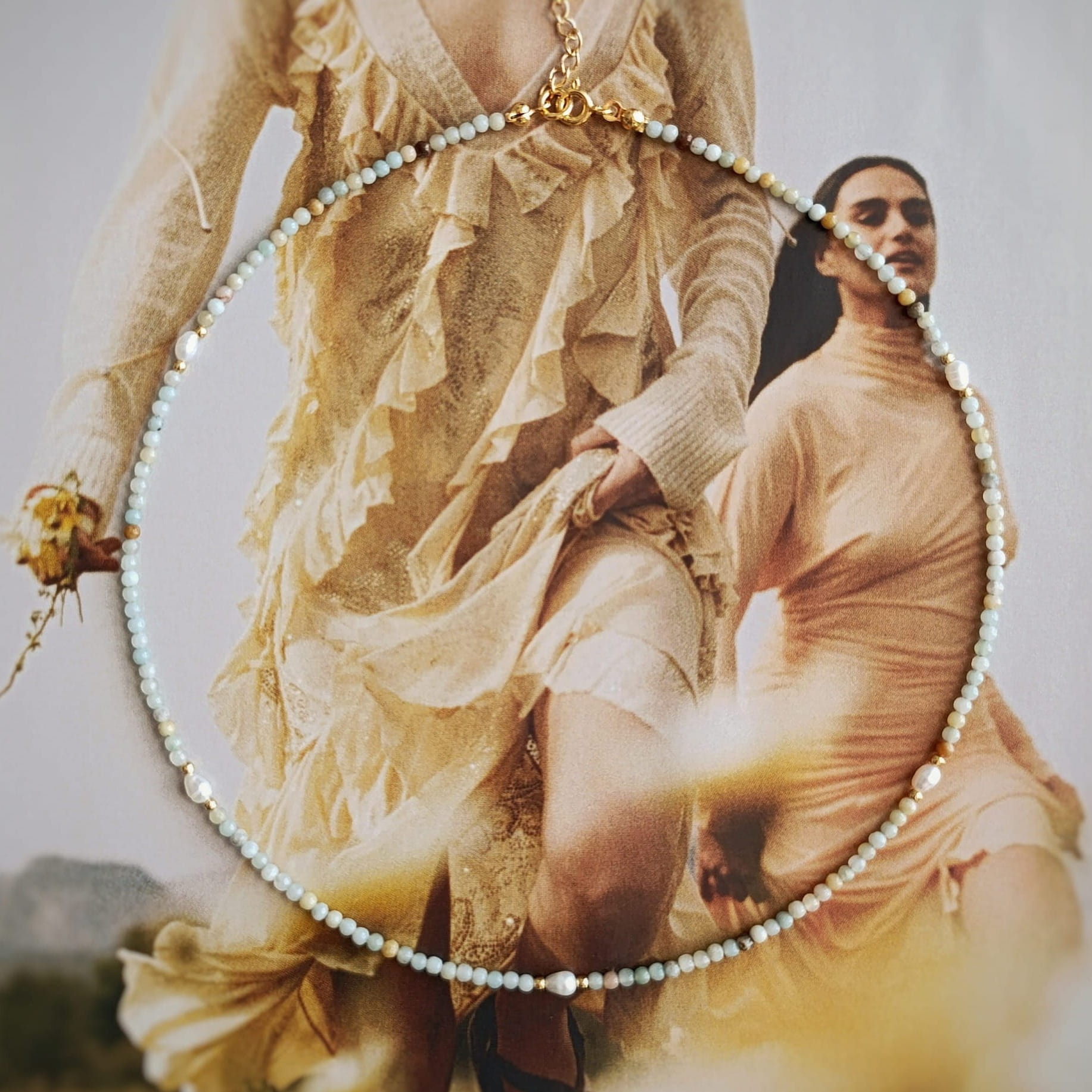 Naszyjnik z naturalnych, gładkich kamieni amazonitu (2,5 mm) i niewielkich perełek, którym towarzyszą kuleczki ze srebra pozłacanego. Wykonany na mocnej lince jubilerskiej. Solidne końcówki przy zapięciu. Długość: 38 cm + 4 cm przedłużki. Możliwość wykonania krótszej lub dłuższej przedłużki lub naszyjnika bez przedłużki. Wszystkie metalowe elementy wykonano ze srebra próby 925 pozłacanego 24-karatowym złotem.