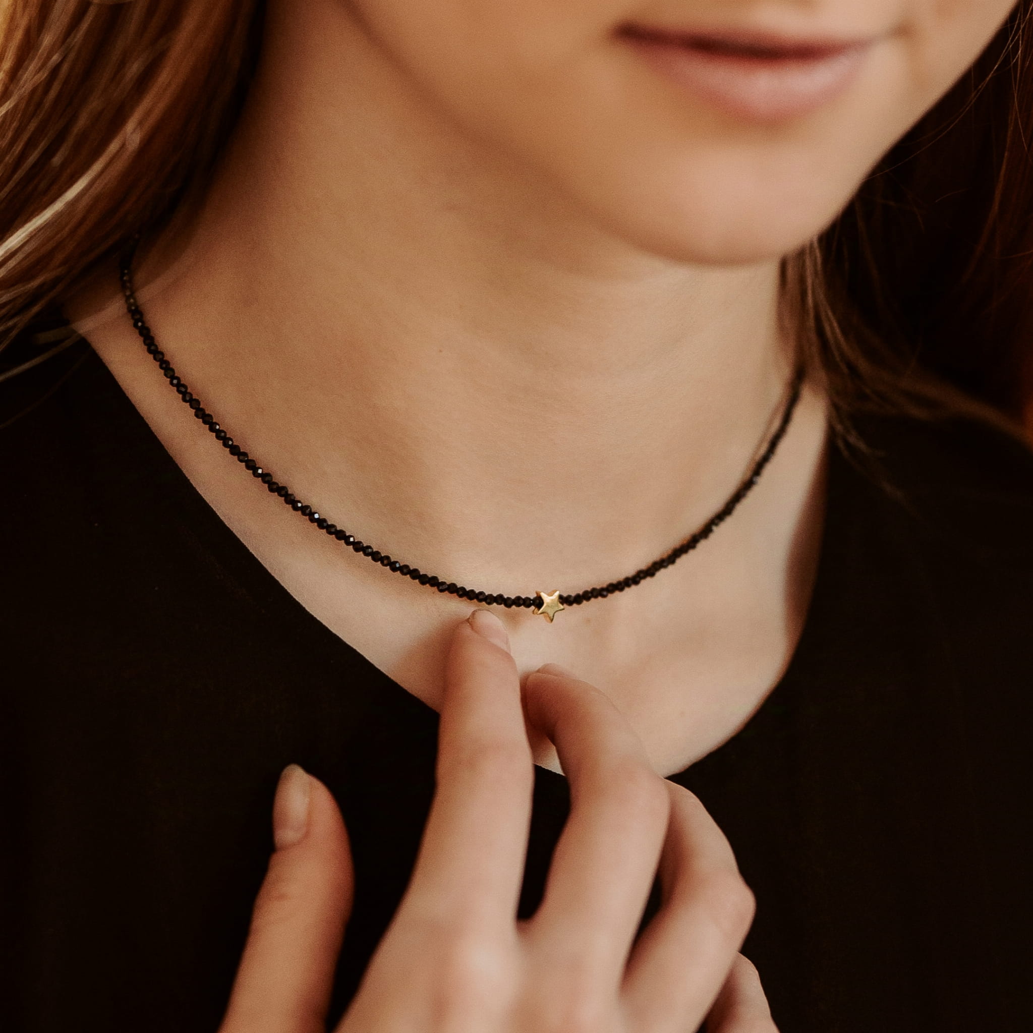 Świąteczny naszyjnik z naturalnych, mieniących się spineli (średnica kamieni ok. 2,5 mm) i ozdobnej, minimalistycznej gwiazdki. Wykonany na mocnej lince jubilerskiej. Długość naszyjnika - 38 cm + 4 cm przedłużki. Złote elementy wykonano ze srebra próby 925 pozłacanego 24-karatowym złotem. Solidne końcówki przy zapięciu. Możliwość wykonania krótszej lub dłuższej przedłużki lub naszyjnika bez przedłużki.