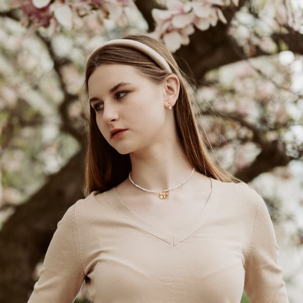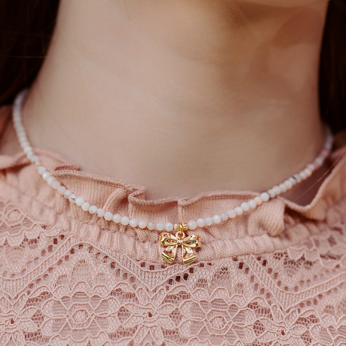 Naszyjnik z naturalnych opali (ok. 3 mm) i kuleczek, a także uroczej kokardki. Wykonany na mocnej lince jubilerskiej. Długość naszyjnika - 38 cm + 4 cm przedłużki. Możliwość wykonania krótszej lub dłuższej przedłużki lub naszyjnika bez przedłużki. Wszystkie elementy wykonano ze srebra próby 925 pozłacanego 24-karatowym złotem. Solidne końcówki przy zapięciu.