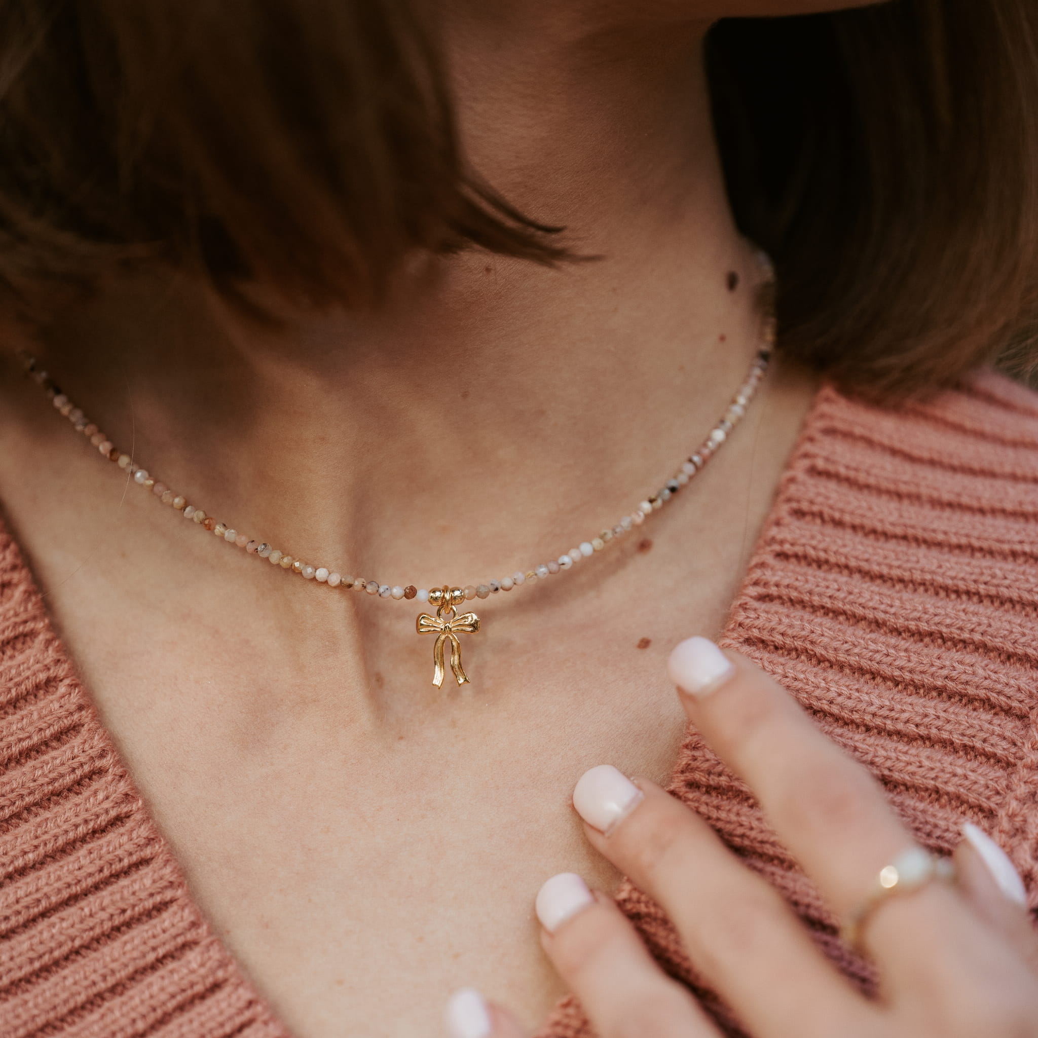 Naszyjnik prosty, a jednocześnie wyjątkowy dzięki przepięknej zawieszce z kokardką. Nieoczywisty urok peruwiańskich opali — kamieni, które zachwycają zróżnicowanymi barwami beżu, brązu i pudrowego różu, niczym drobinki piasku znad Bałtyku.
