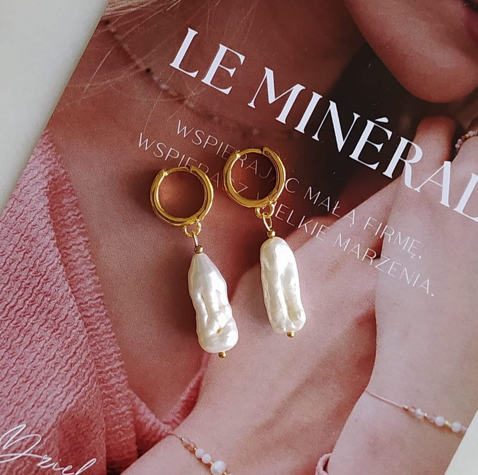 Wyjątkowo efektowne kolczyki ze srebra próby 925 pozłacanego 24-karatowym złotem, z hodowanymi, podłużnymi, lekko nieregularnymi perłami w kolorze białym. Bazą są solidne kółeczka. Sprawdzi się jako dodatek do bardzo eleganckich stylizacji oraz jako biżuteria ślubna. Długość kamieni: ok. 2 cm. Każdy model jest niepowtarzalny.