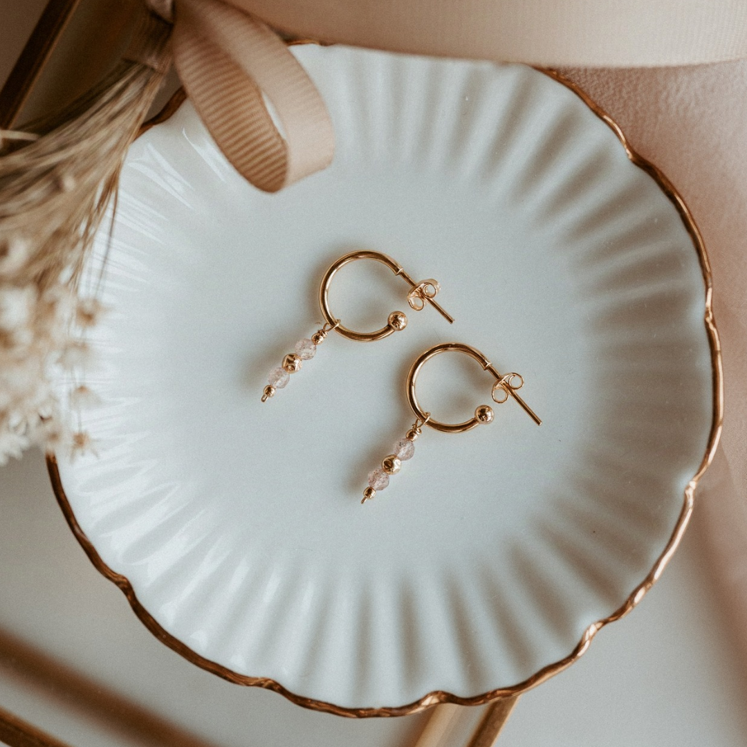 Wyjątkowo efektowne kolczyki ze srebra próby 925 pozłacanego 24-karatowym złotem, z naturalnymi kwarcami truskawkowymi. Bazą są kółeczka z kulką na końcu. Sprawdzi się jako dodatek do bardzo eleganckich stylizacji oraz jako biżuteria ślubna.